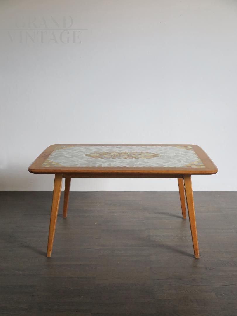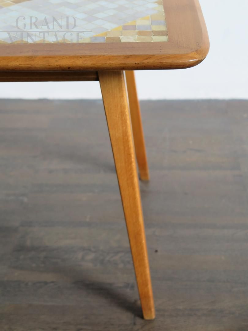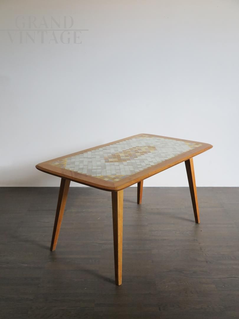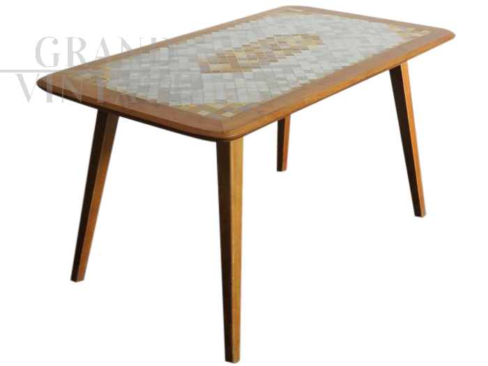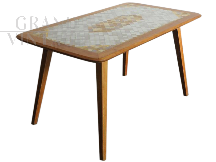 Swiss coffee table, modern vintage, light wood structure and top with glass paste mosaic decoration, precious multicolored tiles including gold color, 50s.