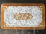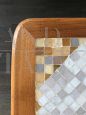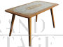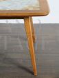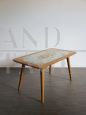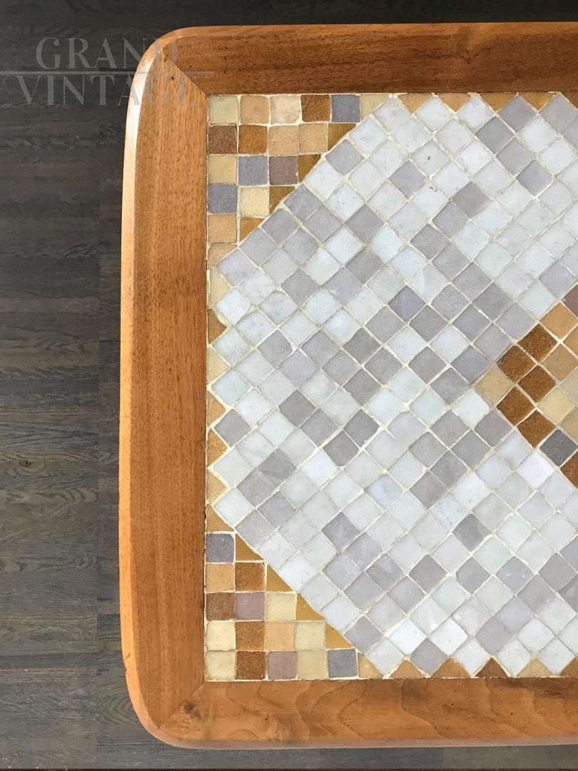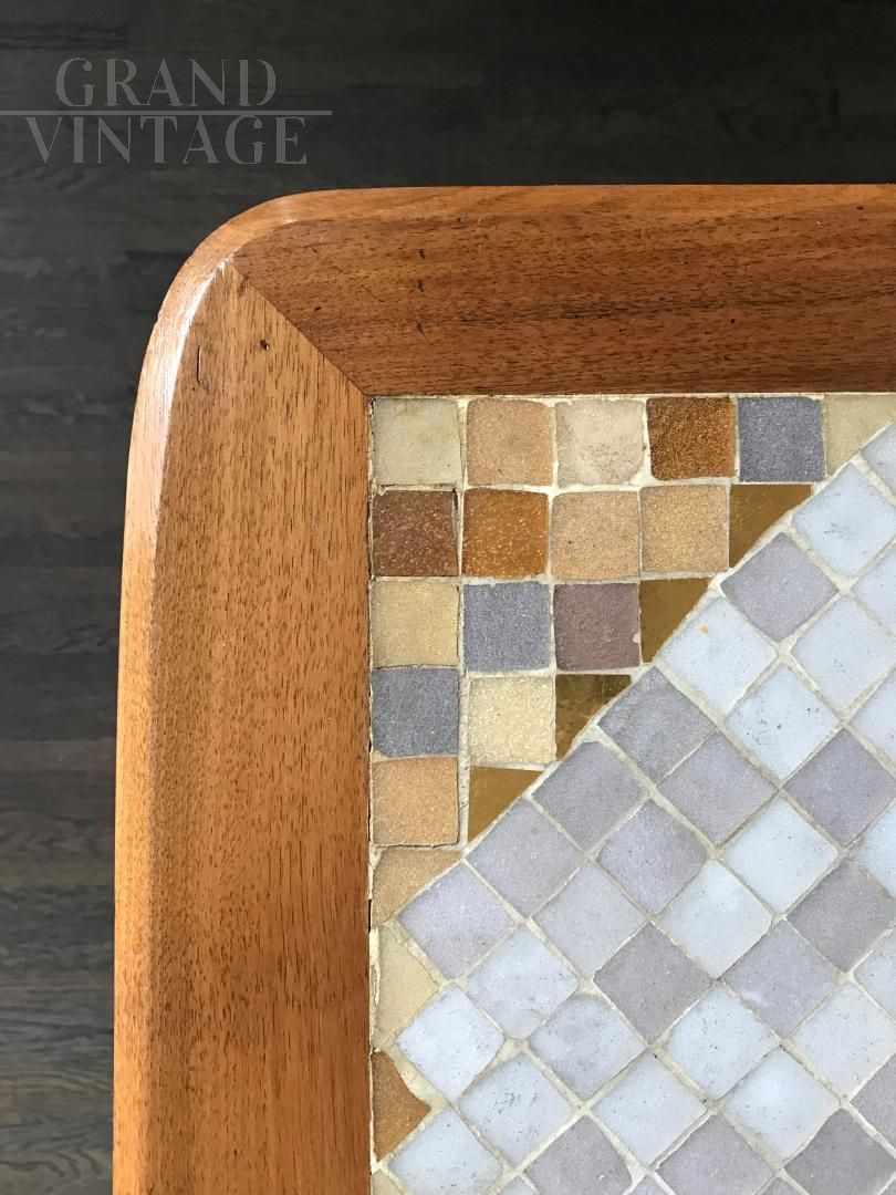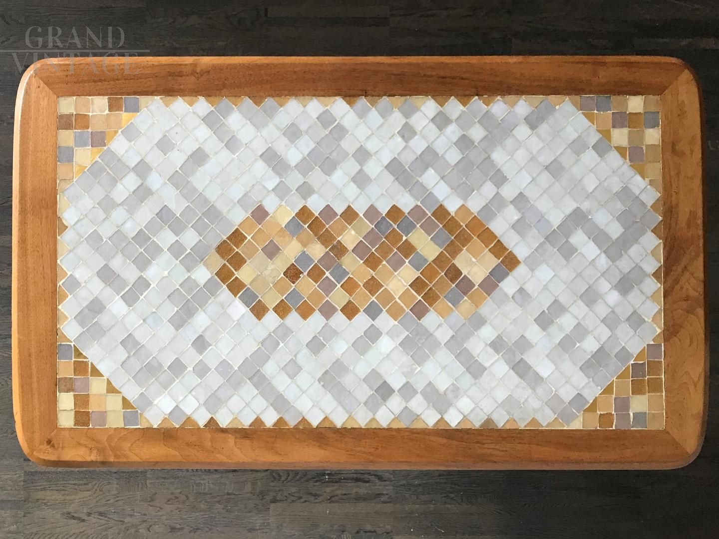 Swiss coffee table, modern vintage, light wood structure and top with glass paste mosaic decoration, precious multicolored tiles including gold color, 50s.