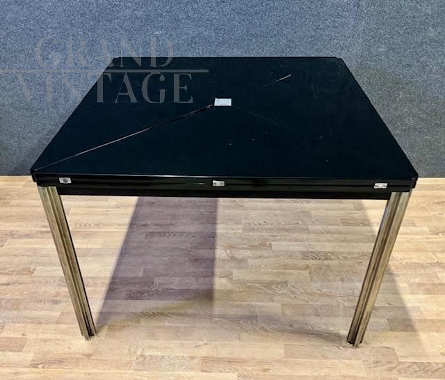 Dining table with metal frame and square lacquered wood top, expandable by rotating on a central pin and opening the flaps on all four sides. Model T92, Designer Eugenio Gerli and Mario Cristiani, Manufacturer Tecno, Year 1960.