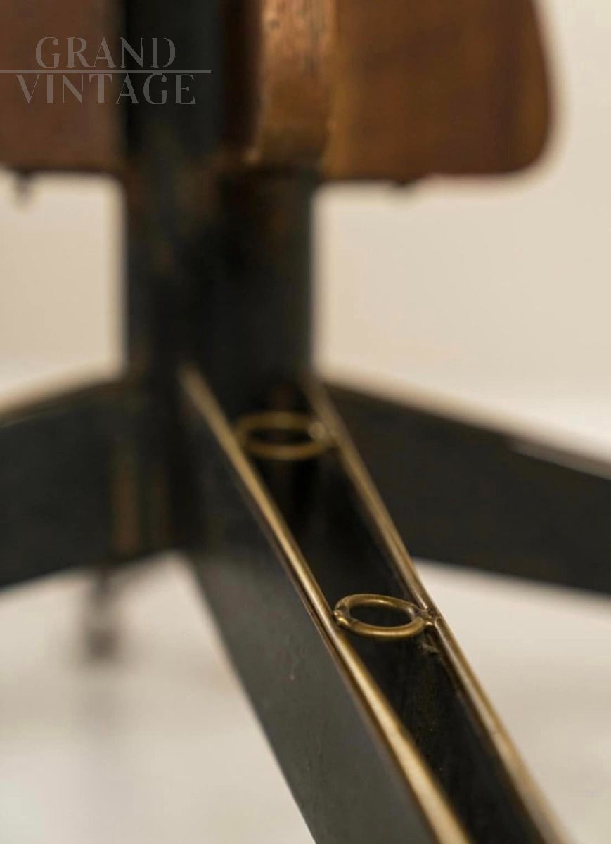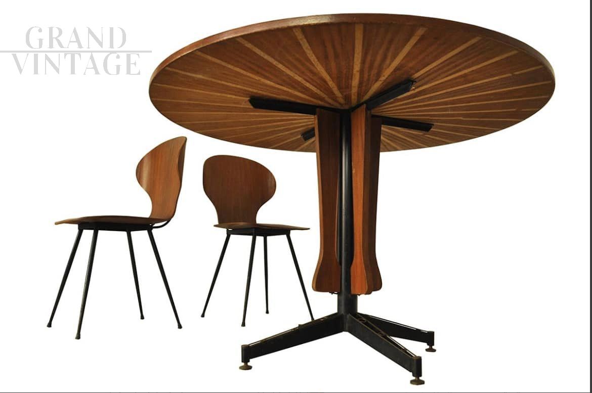 Beautiful dining set designed by Carlo Ratti for Lissoni, Italy 1950s, composed of a round table and six chairs with a splendid curved shape, made of wood-veneered plywood on black lacquered iron and iron rod structures, the chairs have spiked legs and the table a central leg with brass feet. In excellent condition.
