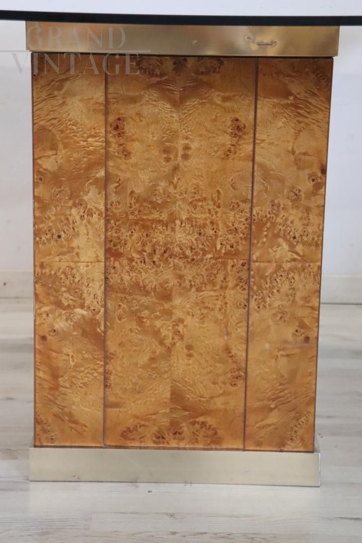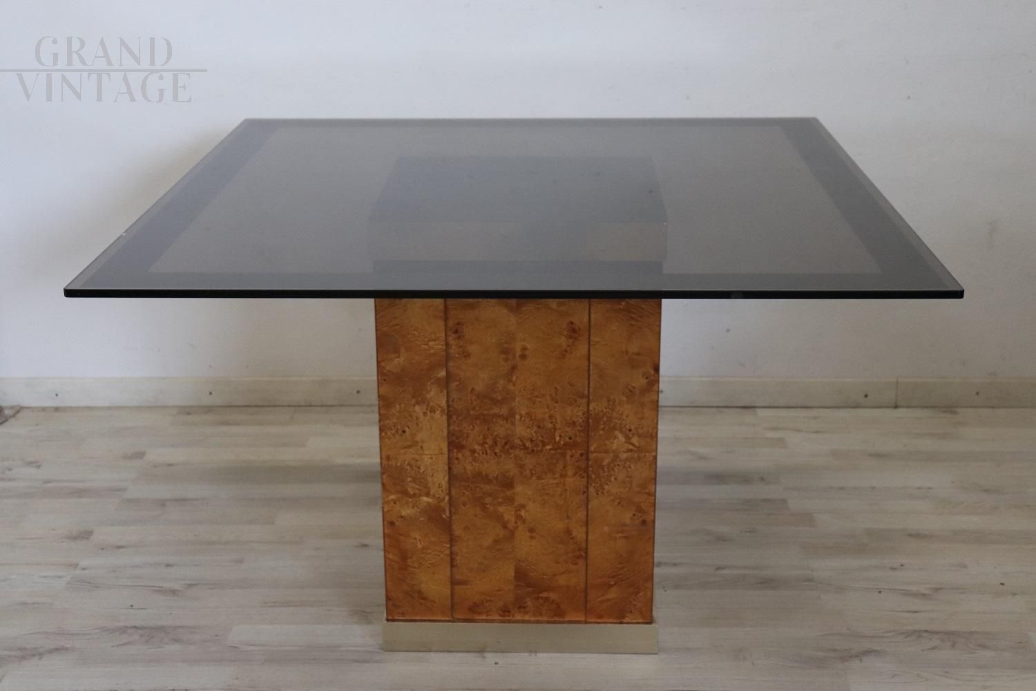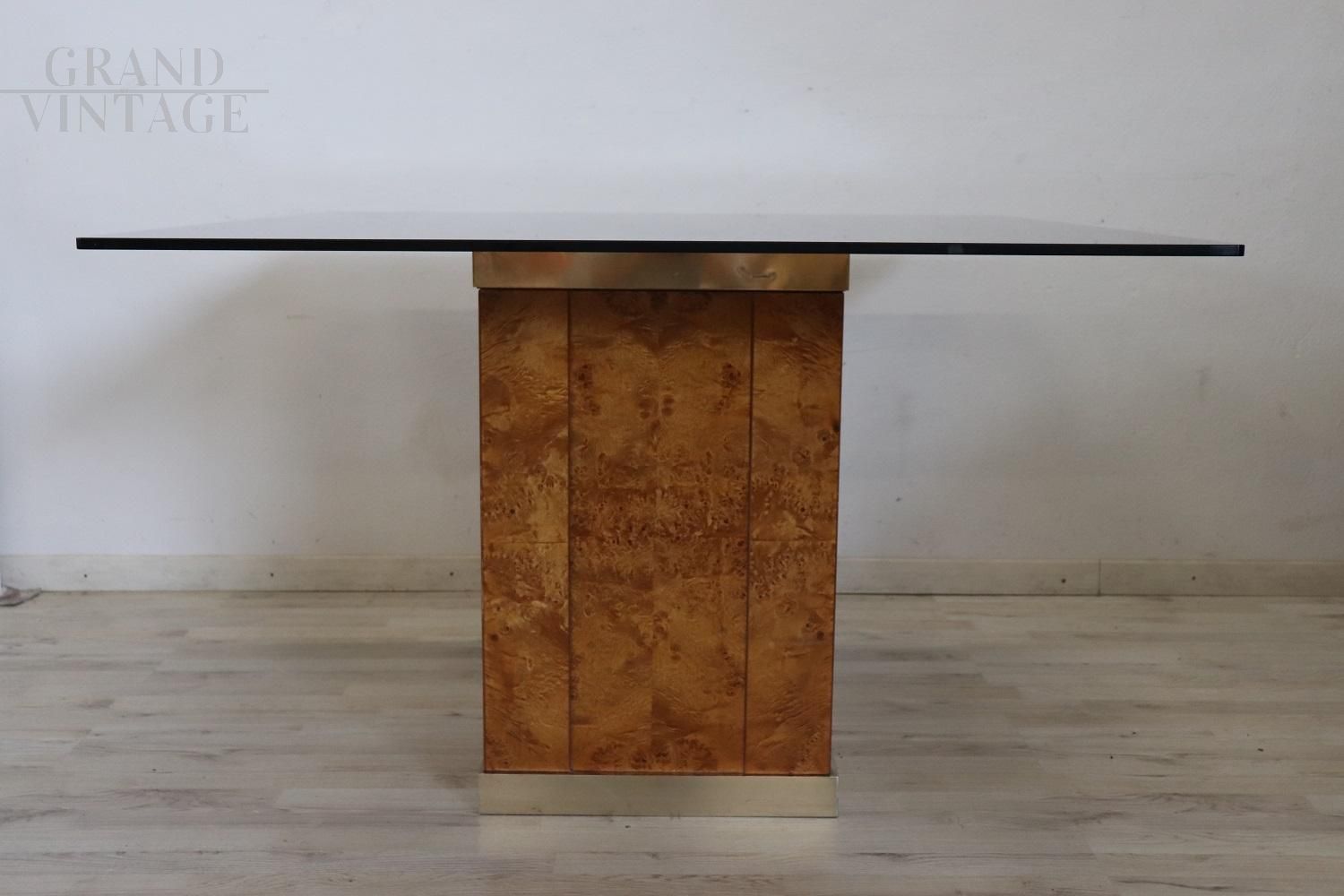 Dining table designed by Jean Claude Mahey for Roche Bobois, 1980s. Refined French design square dining table from the 1980s by Jean Claude Mahey for Roche Bobois. This fantastic table has a base in fine walnut root with golden metal details and a dark smoked glass top. There are some signs of wear on the top and a small mark in the golden metal under the top, as shown in the photo. Perfect table for a modern environment, attributed for characteristics documented in the history of design to the designer/manufacturer shown above. It has no attribution mark imprinted. Price negotiable.