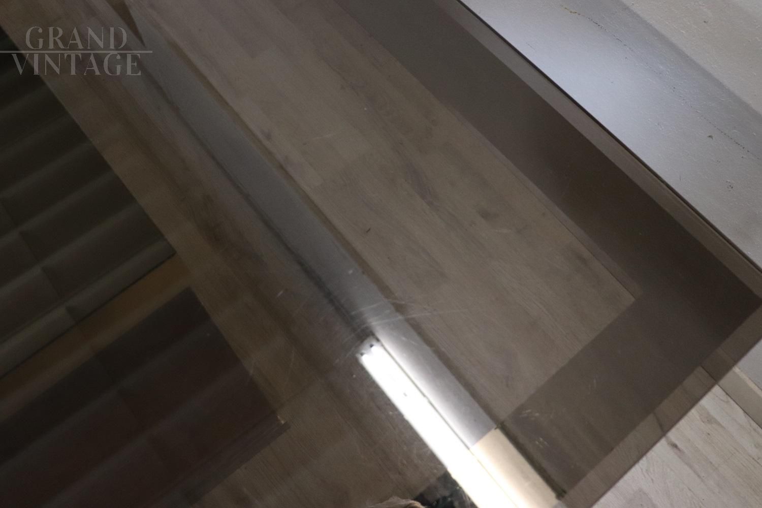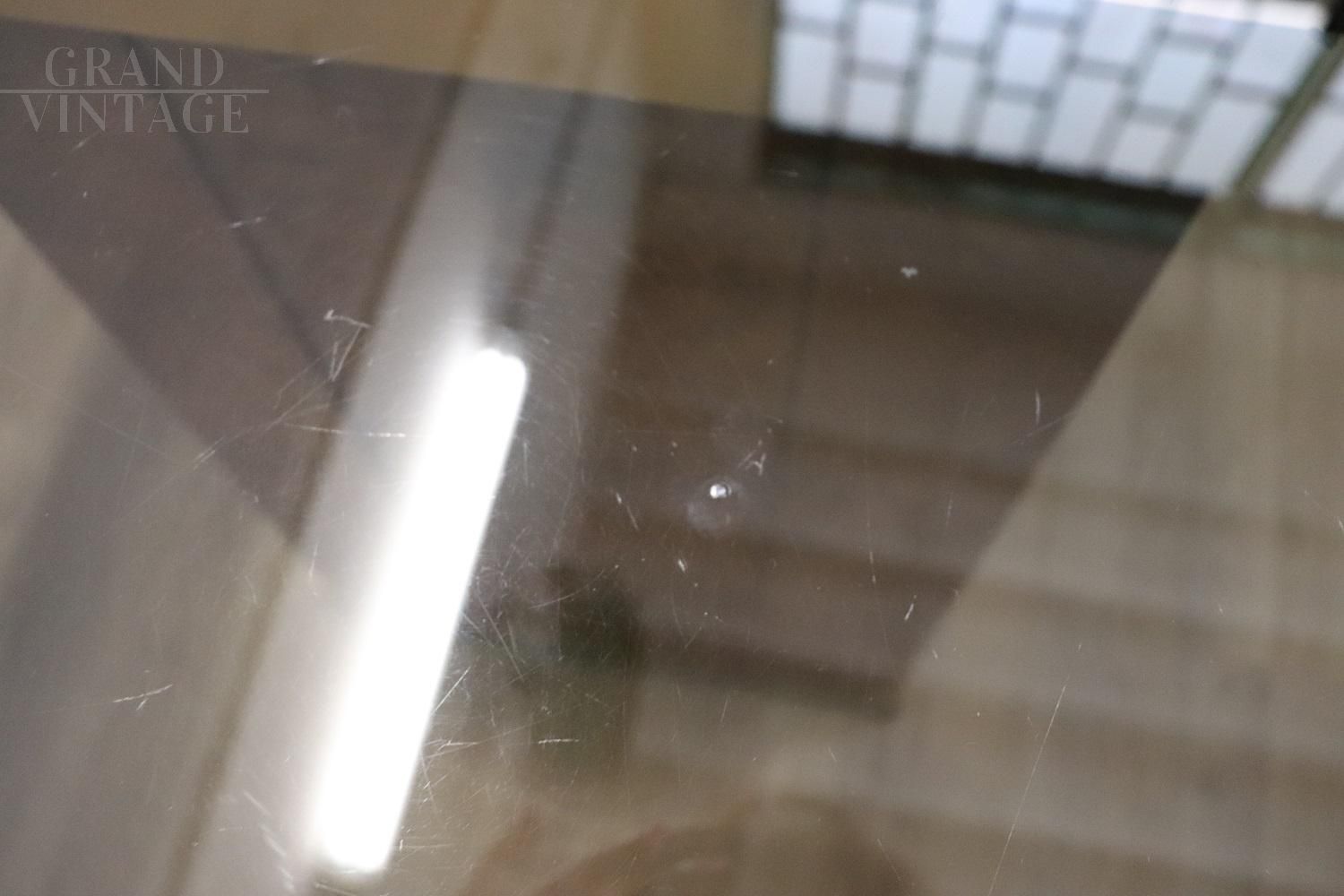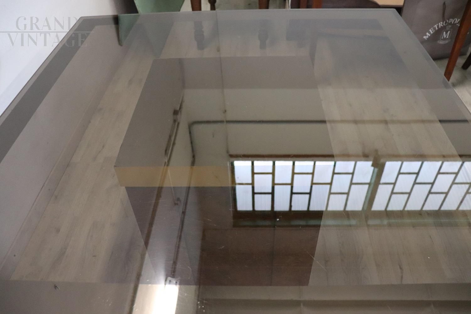 Dining table designed by Jean Claude Mahey for Roche Bobois, 1980s. Refined French design square dining table from the 1980s by Jean Claude Mahey for Roche Bobois. This fantastic table has a base in fine walnut root with golden metal details and a dark smoked glass top. There are some signs of wear on the top and a small mark in the golden metal under the top, as shown in the photo. Perfect table for a modern environment, attributed for characteristics documented in the history of design to the designer/manufacturer shown above. It has no attribution mark imprinted. Price negotiable.