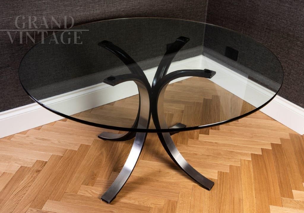 T69 table by Osvaldo Borsani and Eugenio Gerli for Tecno, with metal base and round glass top.