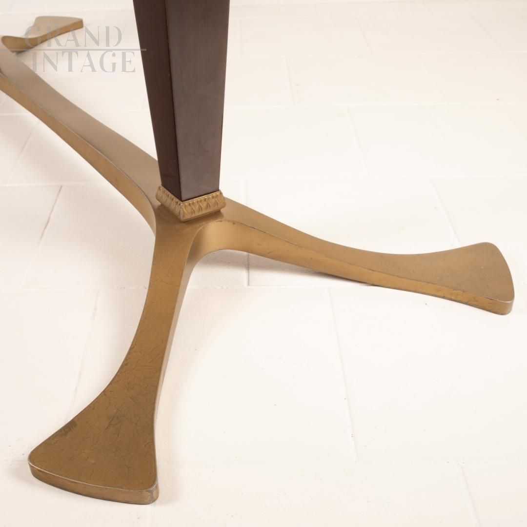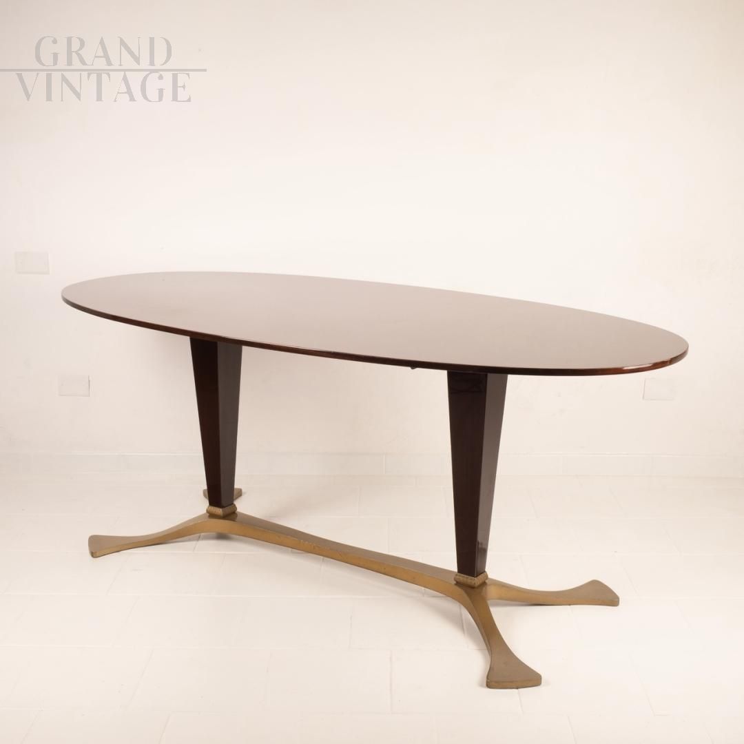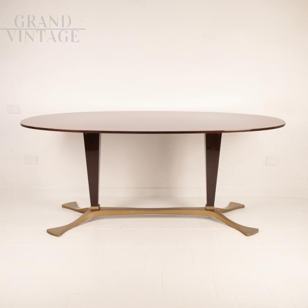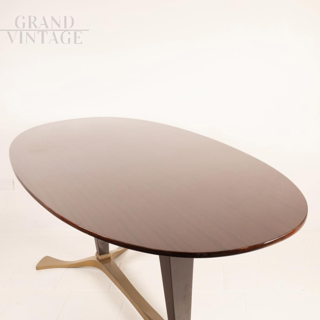 Mid-century table by Fulvio Brembilla for Rossana RB Design with oval top in mahogany feather and structure in wood and brass-plated aluminium, Italy early 1950s. The table is made up of two wooden bases on a brass-plated aluminum base, branded with the original label. Perfect both as a dining table and for furnishing a living room, this table is a unique piece that marks the beginnings of Rossana RB, and is in perfect condition with minimal signs of aging, visible in the photos.