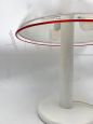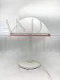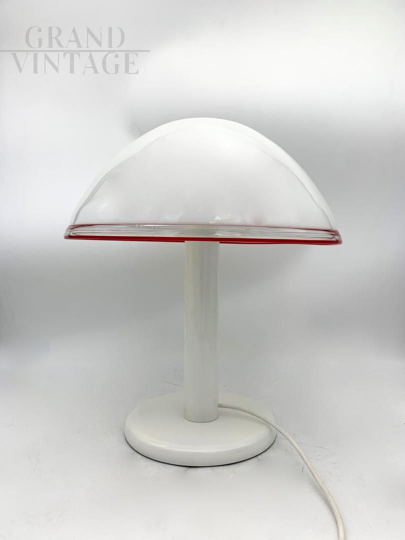 Table lamp attributed to the Leucos company in handmade Murano glass in milky white with red edge finishing, made in the 1970s. The supporting structure is made of white painted iron, the original colour. The lamp has a total of 2 sockets for E14 type bulbs. Newly redone electrical system, on request it can be prepared with an American system.