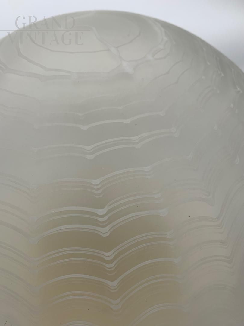 Splendid table lamp attributed to Venini in satin Murano glass, ground and decorated by hand on a brass base, Italy - Murano, 1970s. The lamp is in good condition, with the electrical system redone. Glass in good condition, not chipped or cracked. The lamp has an ignition with E27 lamp holder. It has some signs of age. Perfect for lighting bedrooms or passageways. The lamp will be disassembled and well packaged to ensure safe transportation.