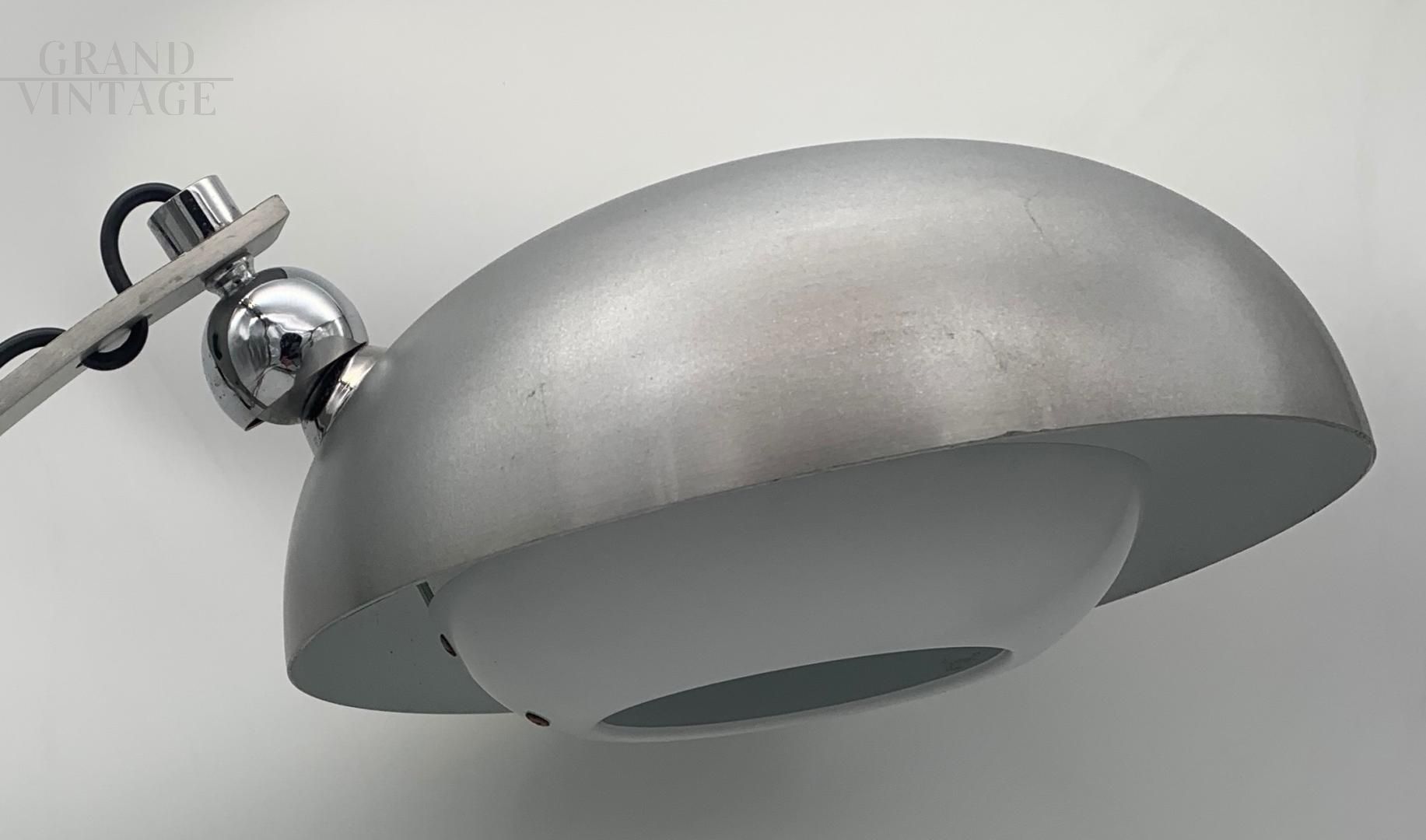 Fantastic lamp attributed to the designer Angelo Lelii for Arredoluce in chromed metal, Italian modern design from the 60s - 70s. In good condition, the chrome has some traces of age but is still very beautiful. It has an E27 type bulb socket, it has been restored and rewired with all new electrical system. The color is light grey. When lit, the lamp gives a beautiful effect and creates atmosphere.