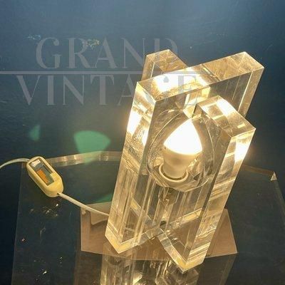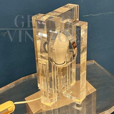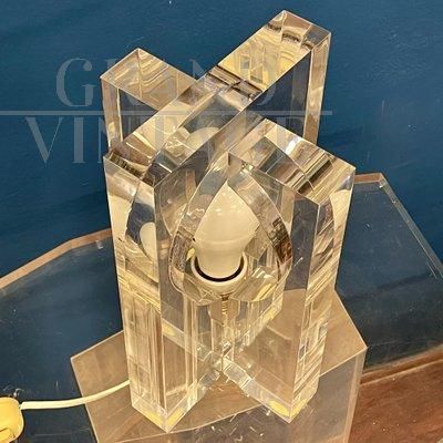 Design table lamp by Sandro Petti for Maison Jansen from the 70s in Lucite plexiglass, composed of thick interlocking elements that, sliding between them, give access to a large central bulb.