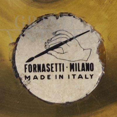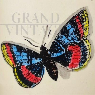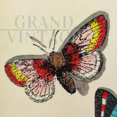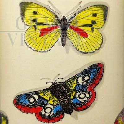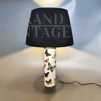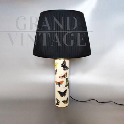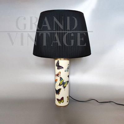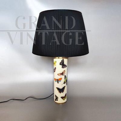 Splendid rare table lamp design by Piero Fornasetti Farfalle collection, made in Italy in the 1970s. This lamp is unique and is in excellent condition, signed on the bottom and in perfect working order. Black silk lampshade is included.