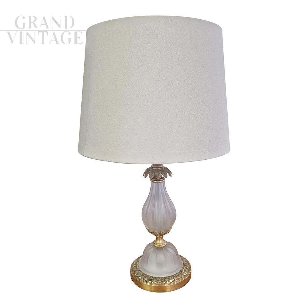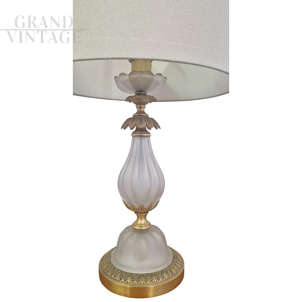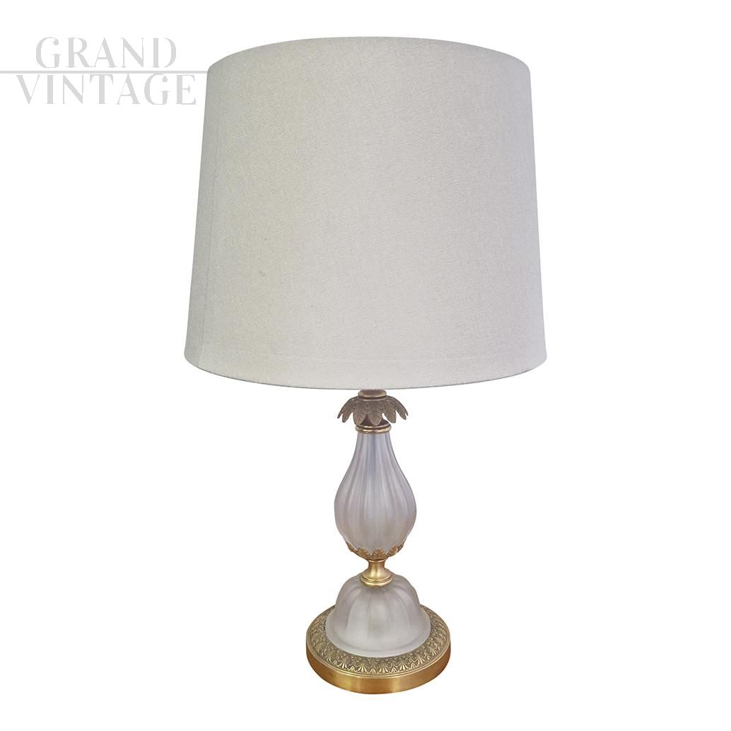 Table lamp abat-jour in satin white Murano glass with beautiful decorations in gilded bronze and classic lampshade in white fabric, working with an E27 type bulb.