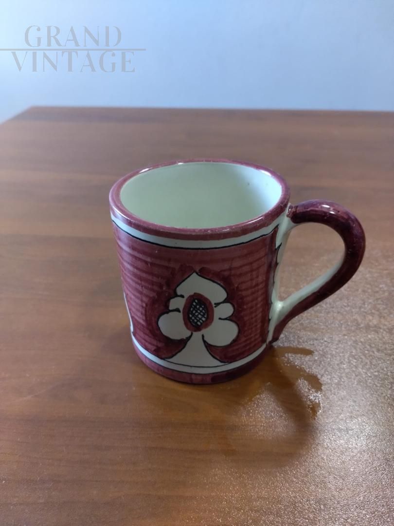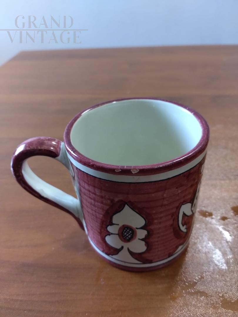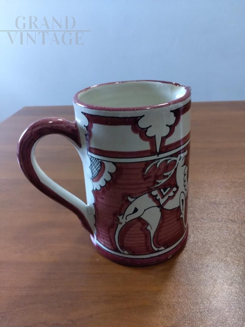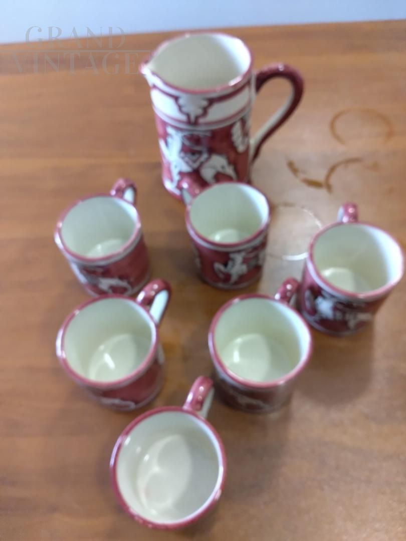 Beautiful set of Larce Orvieto ceramics consisting of a jug and 6 cups, all glazed and hand painted in burgundy color with scenes of animals, flowers and plants different for each glass. The set is offered in the condition in which it was found and may require general restoration work.