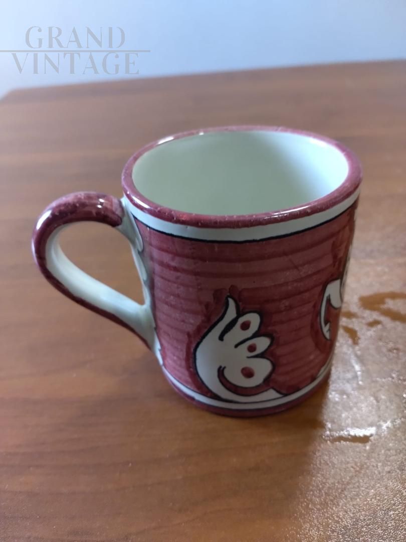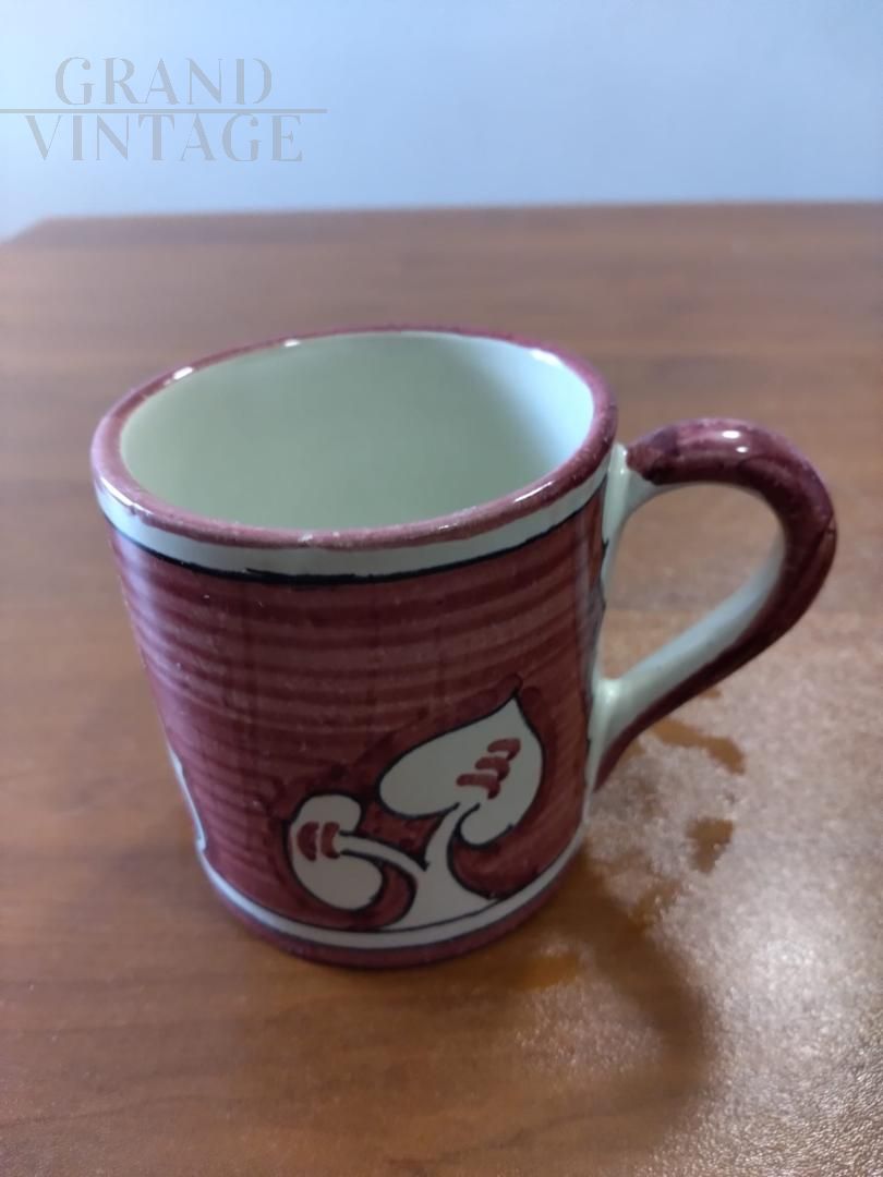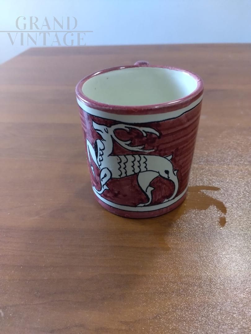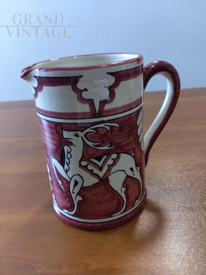 Beautiful set of Larce Orvieto ceramics consisting of a jug and 6 cups, all glazed and hand painted in burgundy color with scenes of animals, flowers and plants different for each glass. The set is offered in the condition in which it was found and may require general restoration work.