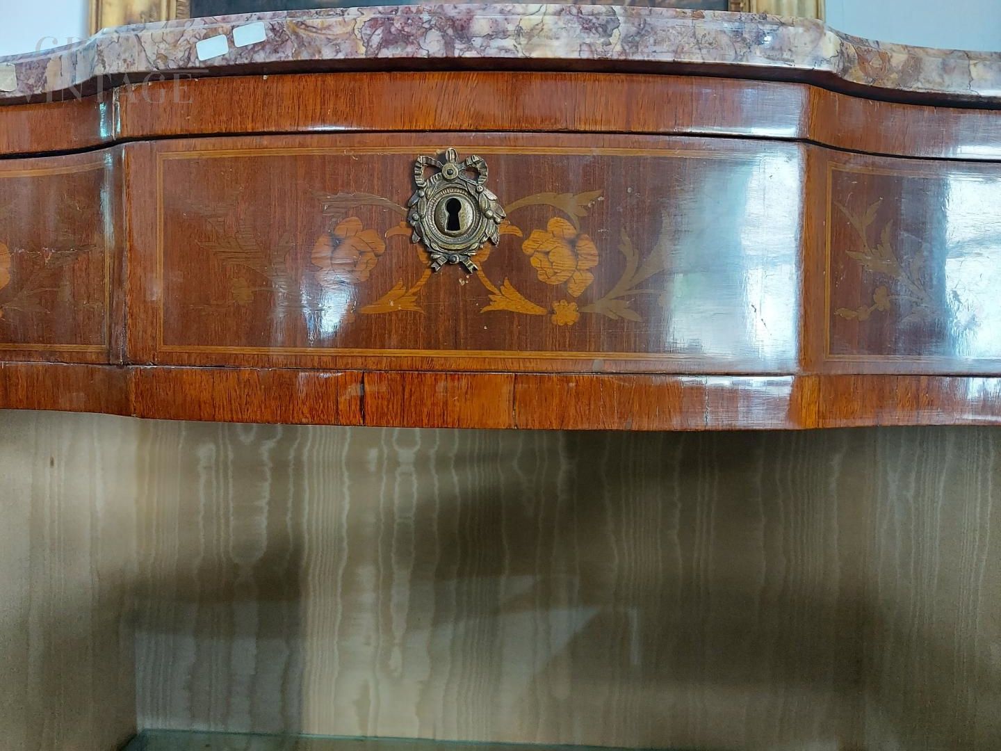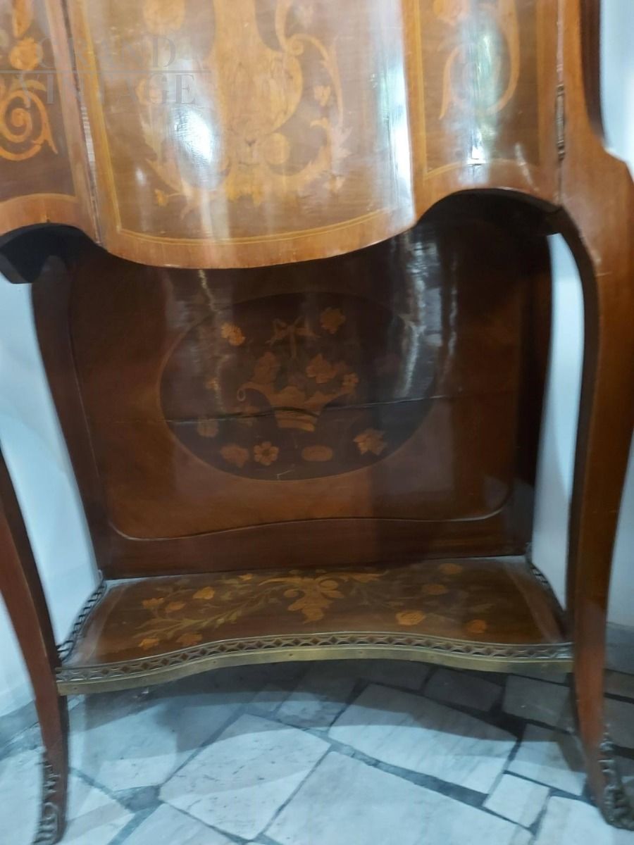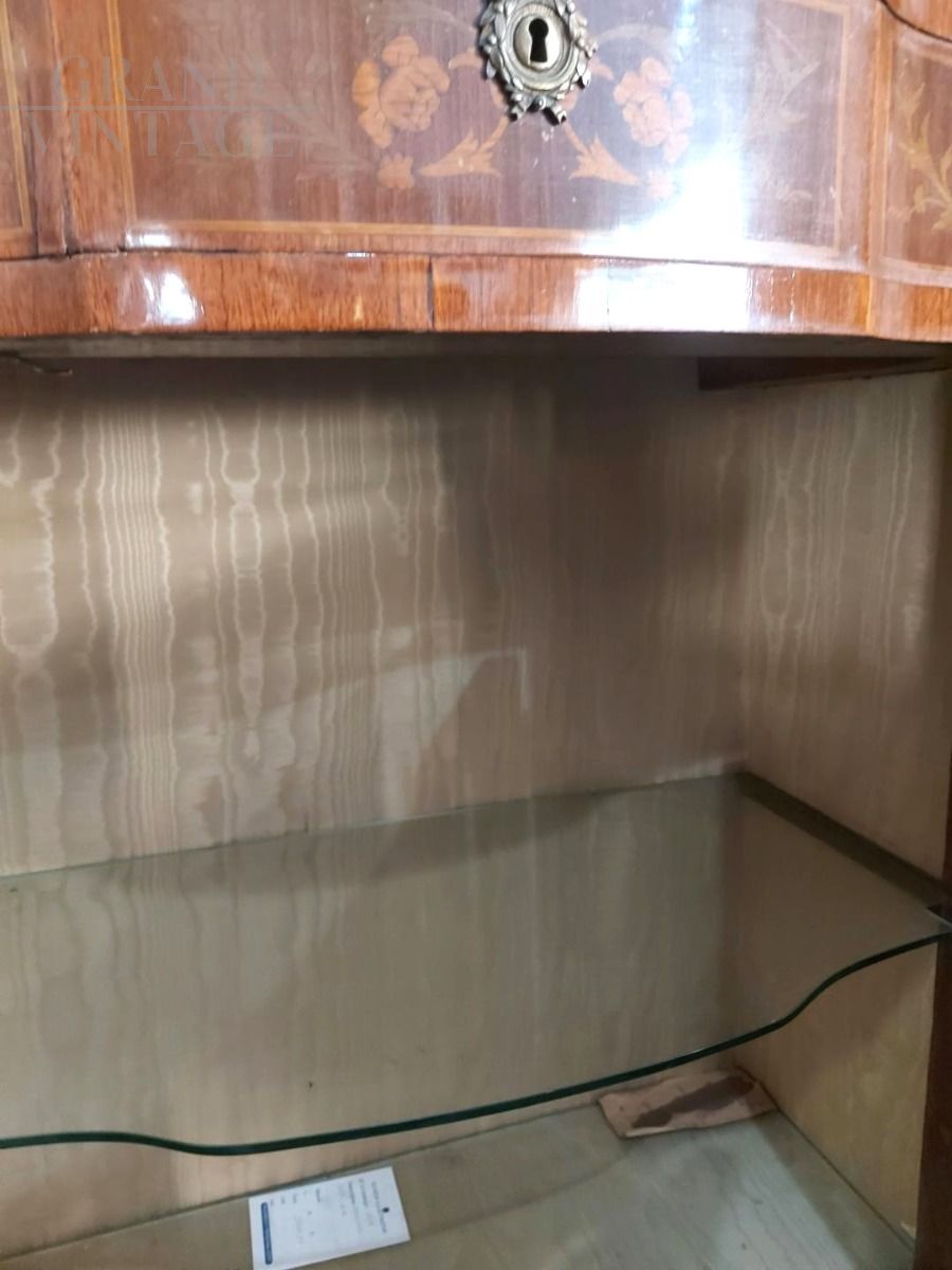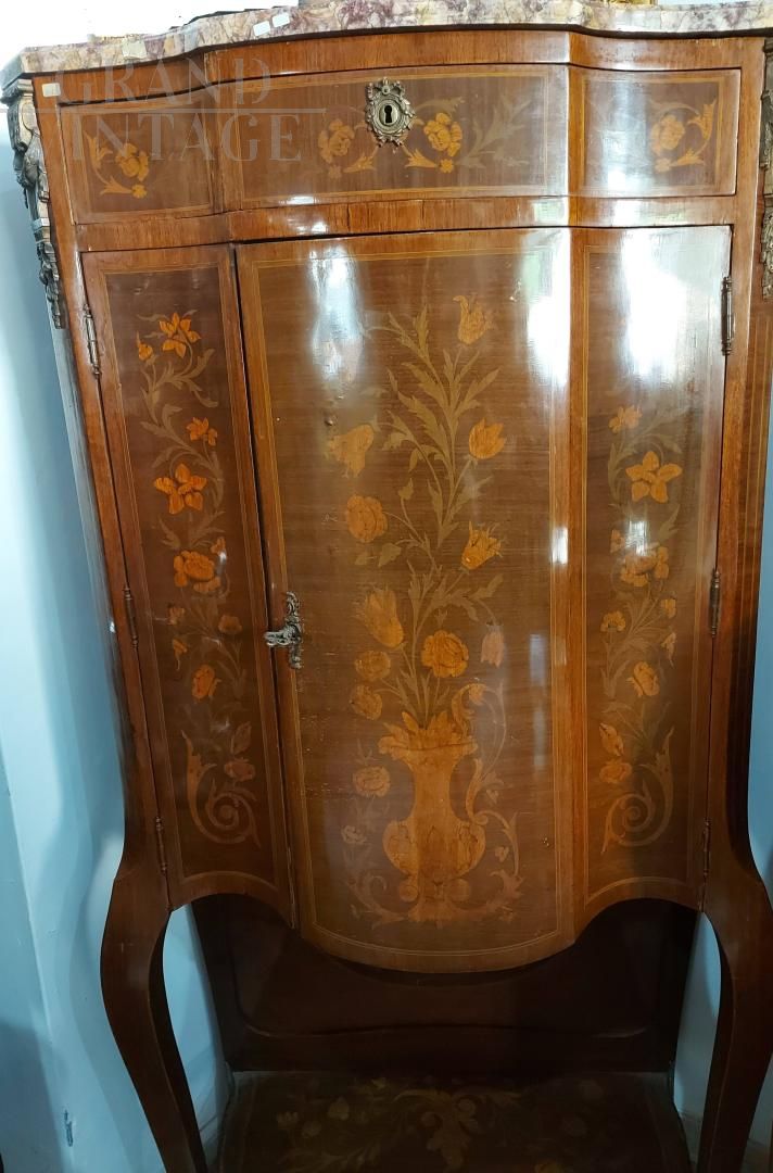Tall bookcase with one door in Napoleon III style, with upper drawer, bronze details, marble top, inlays in precious bois de rose wood with floral motifs, boxwood trim. Interior set up as a bar cabinet, with glass shelves and upholstered front and side panels. Napoleon III style, late 19th century, France.