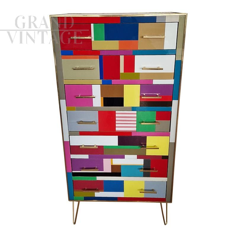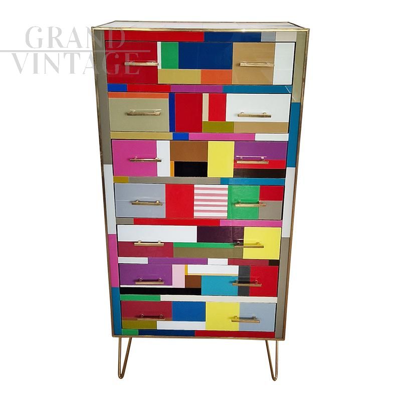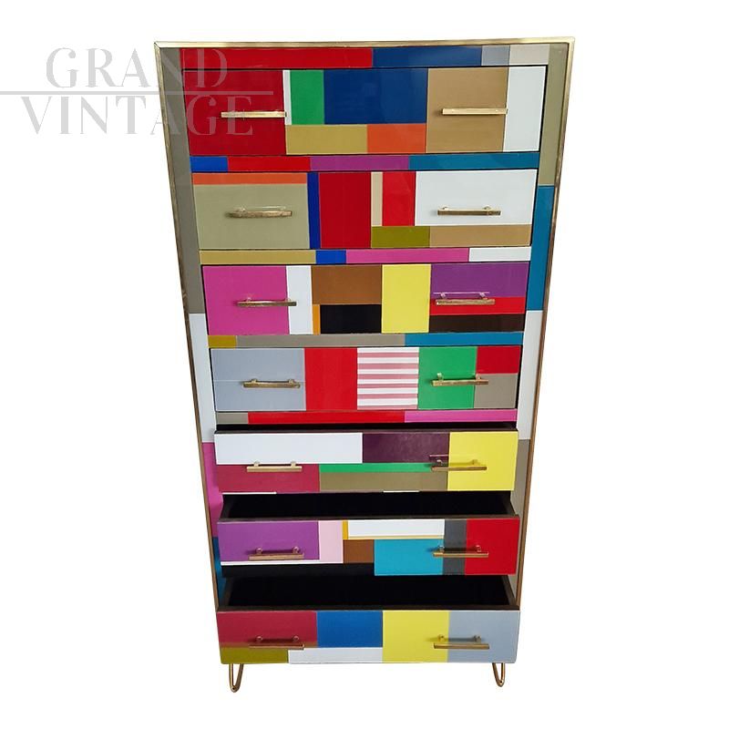 Tallboy dresser chest of drawers entirely handmade, with wooden structure covered in colored glass; details, handles and feet in golden brass.