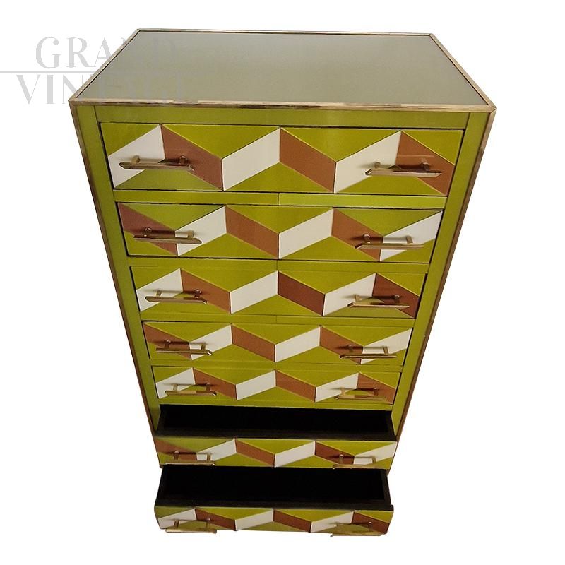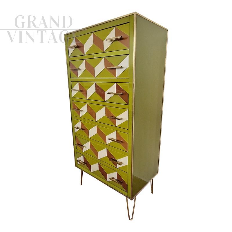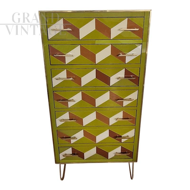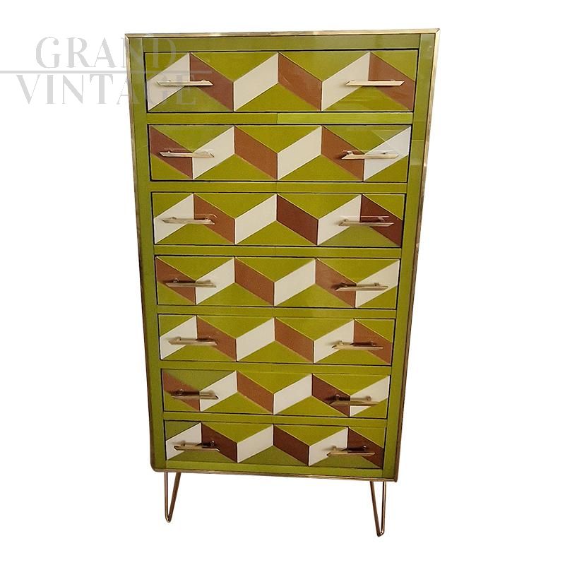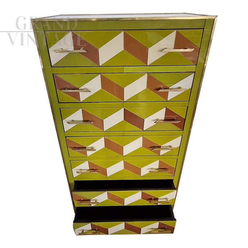 Tallboy dresser chest of drawers entirely handmade, with wooden structure covered in green, brown and white optical effect colored glass with geometric patterns; profiles, handles and feet in golden brass.