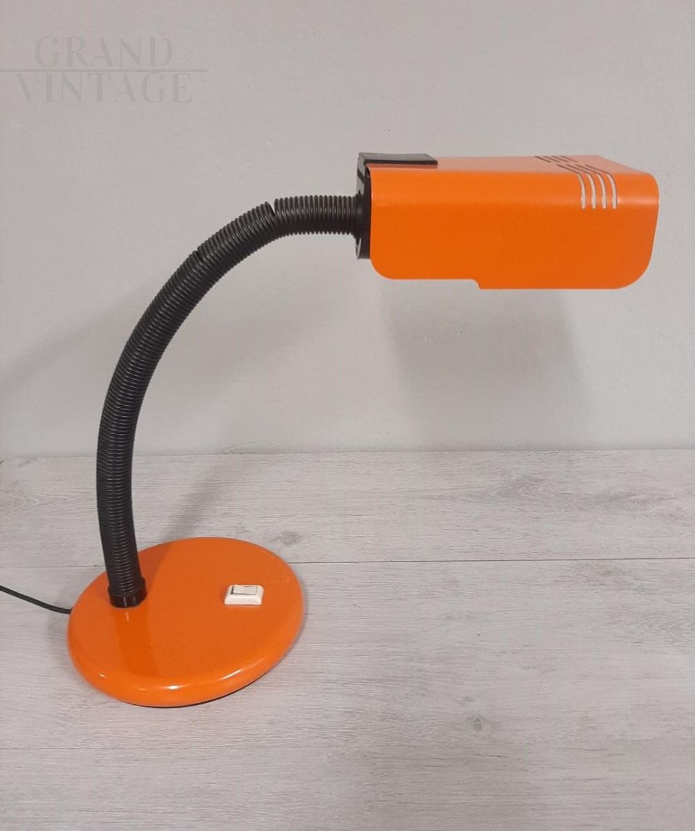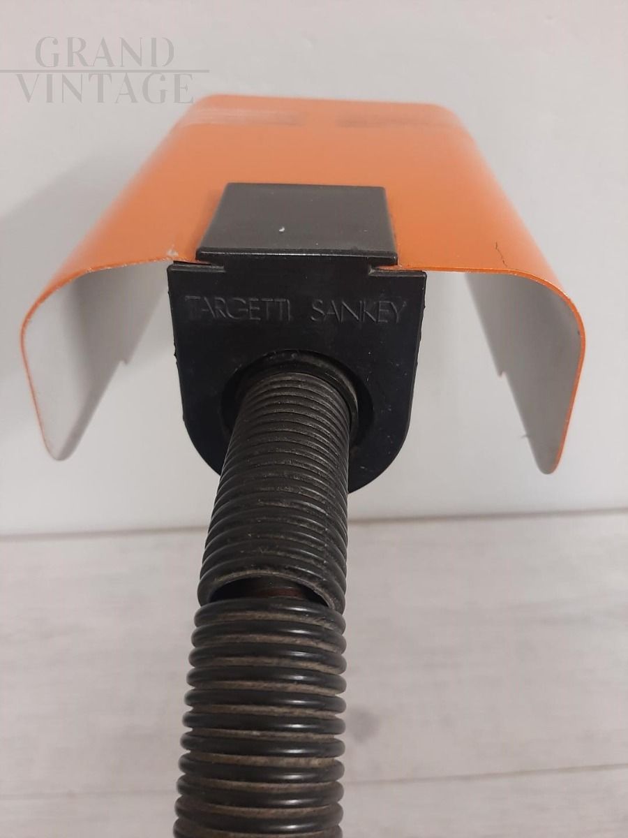 Targetti Sankey desk lamp from the 70s in orange metal, with adjustable arm, working. The adjustable spring is cut in some points, as shown in the photo. In good condition, it shows the natural signs of aging.