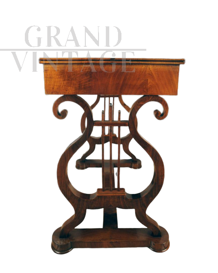 Empire style coffee table, early 19th century; entirely veneered in walnut, "piumato" and walnut briar. It has a drawer with compartments and elegant "lyre" legs.