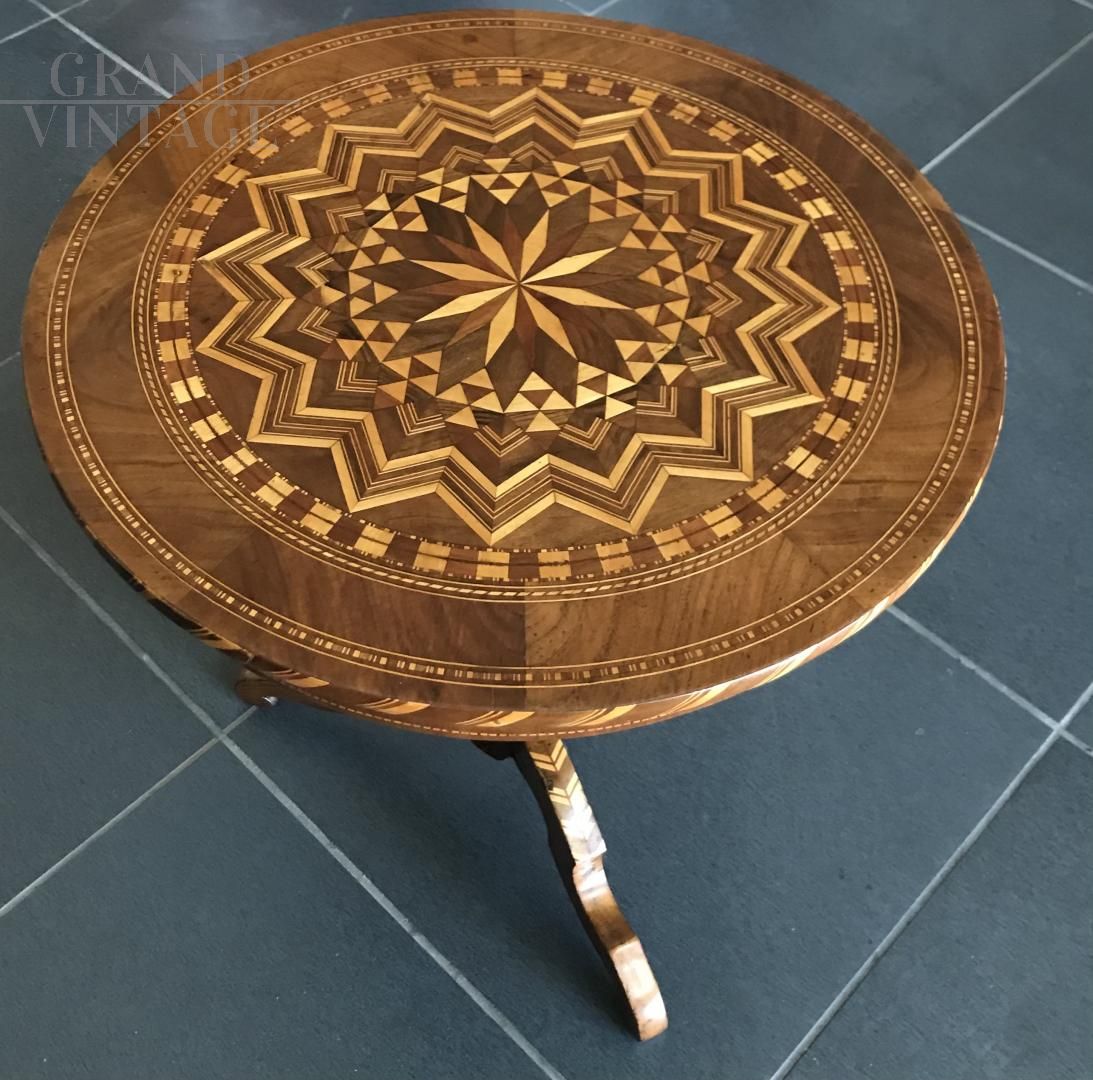 Beautiful Sorrentino walnut tripod coffee table, all exquisitely inlaid, with a small drawer in the undertop band. Very good condition.