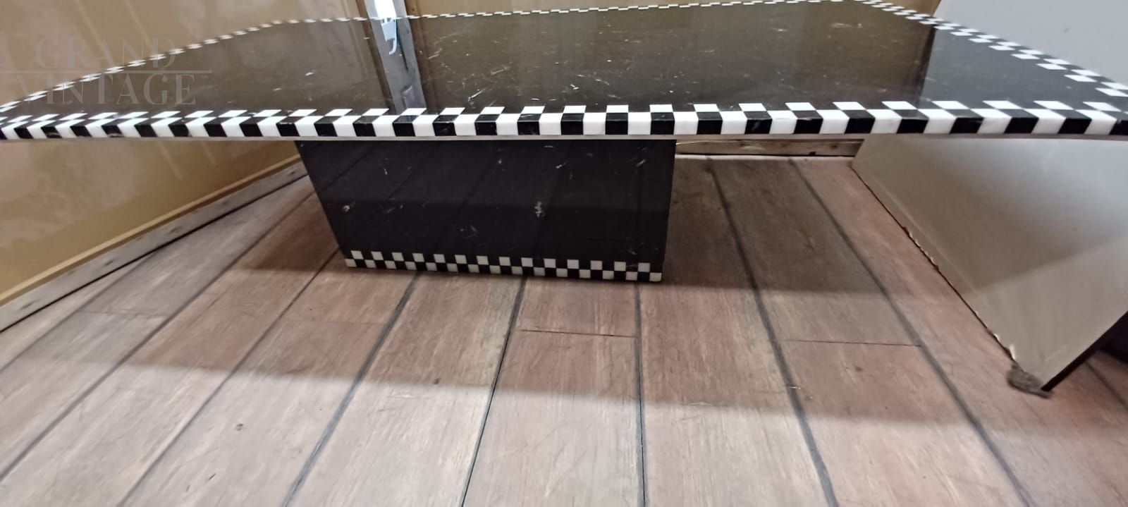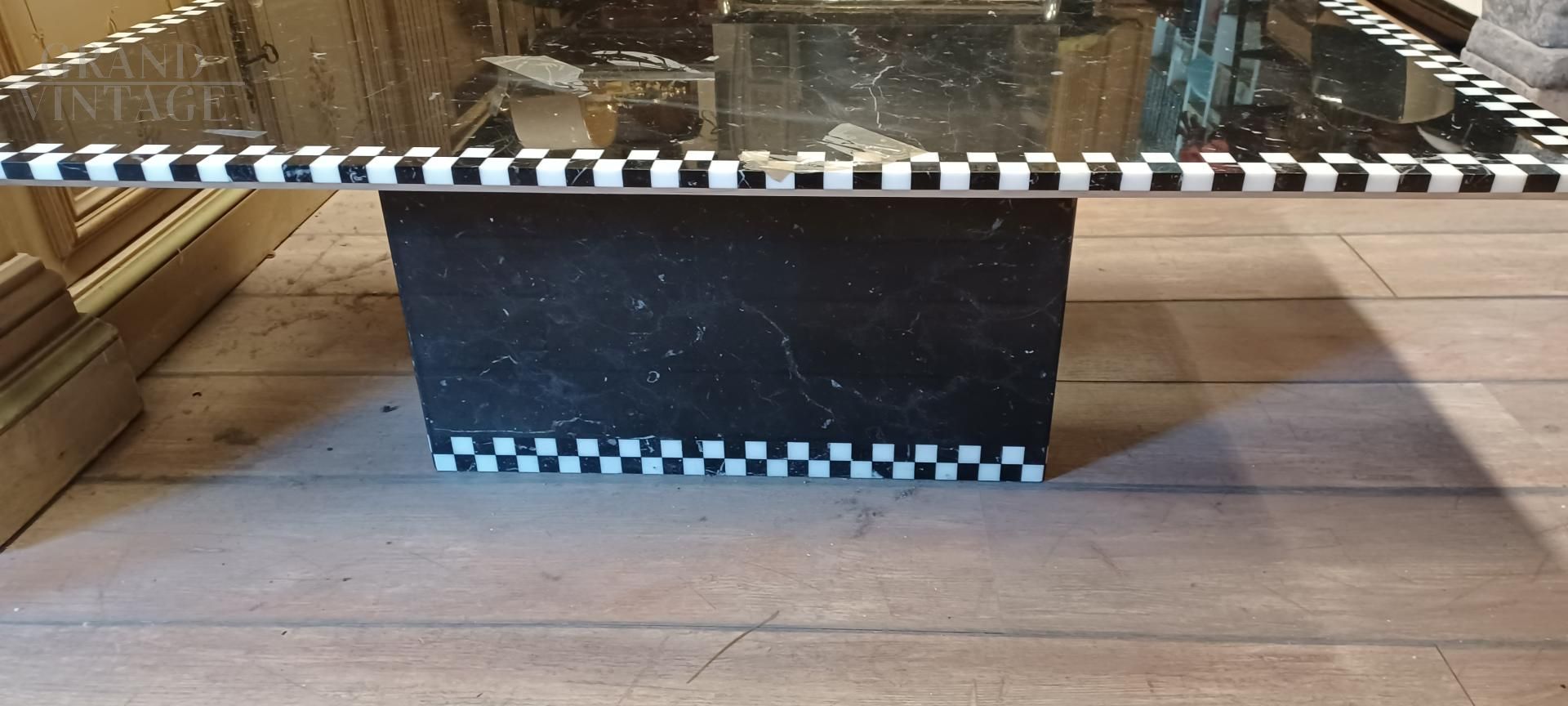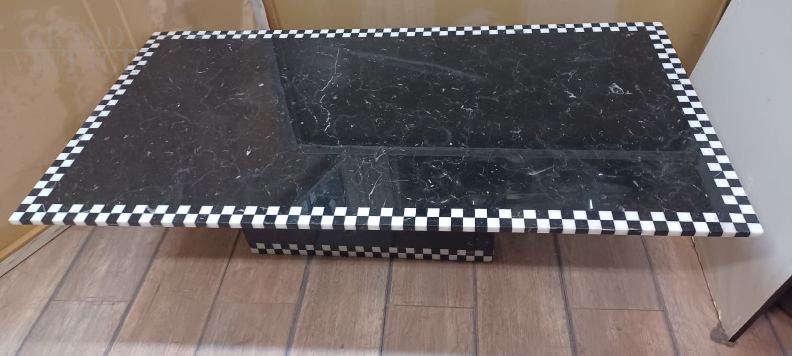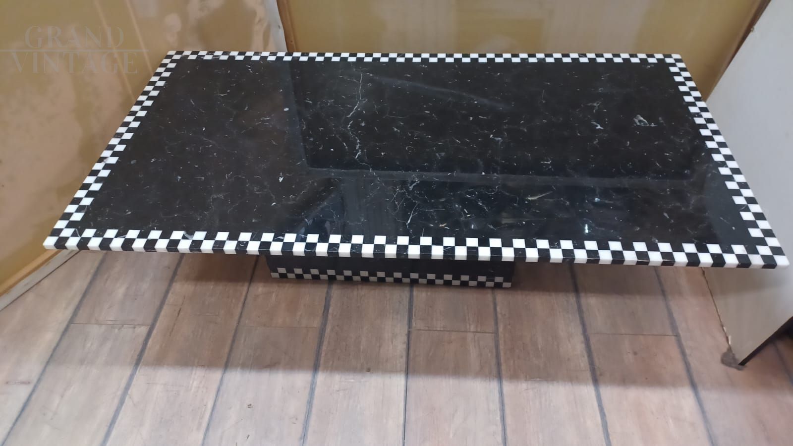 Gorgeous Greca coffee table by Giulio Lazzotti for UpGroup in black Marquina marble with checkerboard decorations in white Carrara marble. The table is totally in marble, both the base and the top, does not have any marks or stickers.