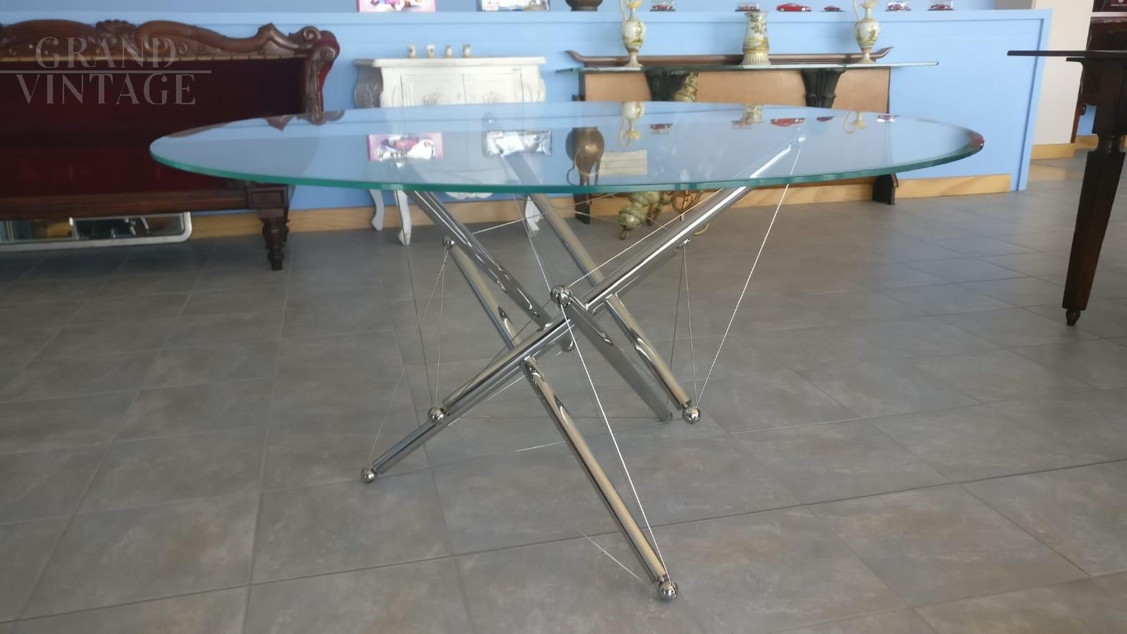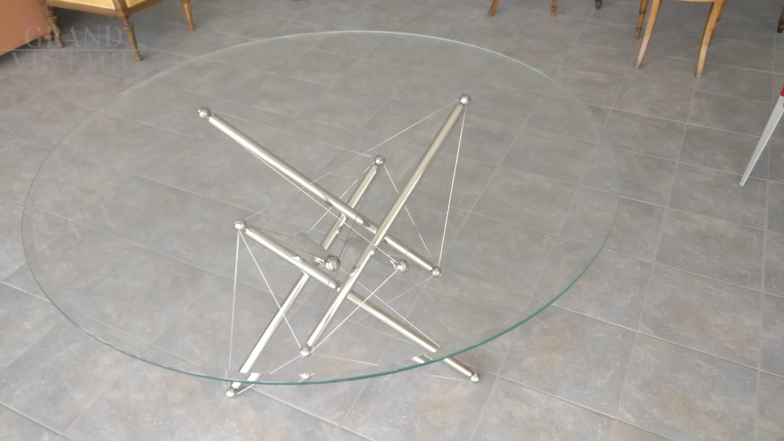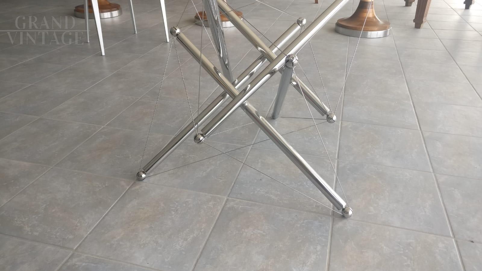 Details: Table with structure and turnbuckles in polished chromed steel, glass top (12 mm thick) with beveled edge on the lower side. Six legs, three of which support the glass top but do not touch the floor, while the other three, conversely, touch the ground without touching the top.