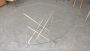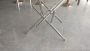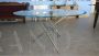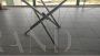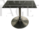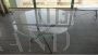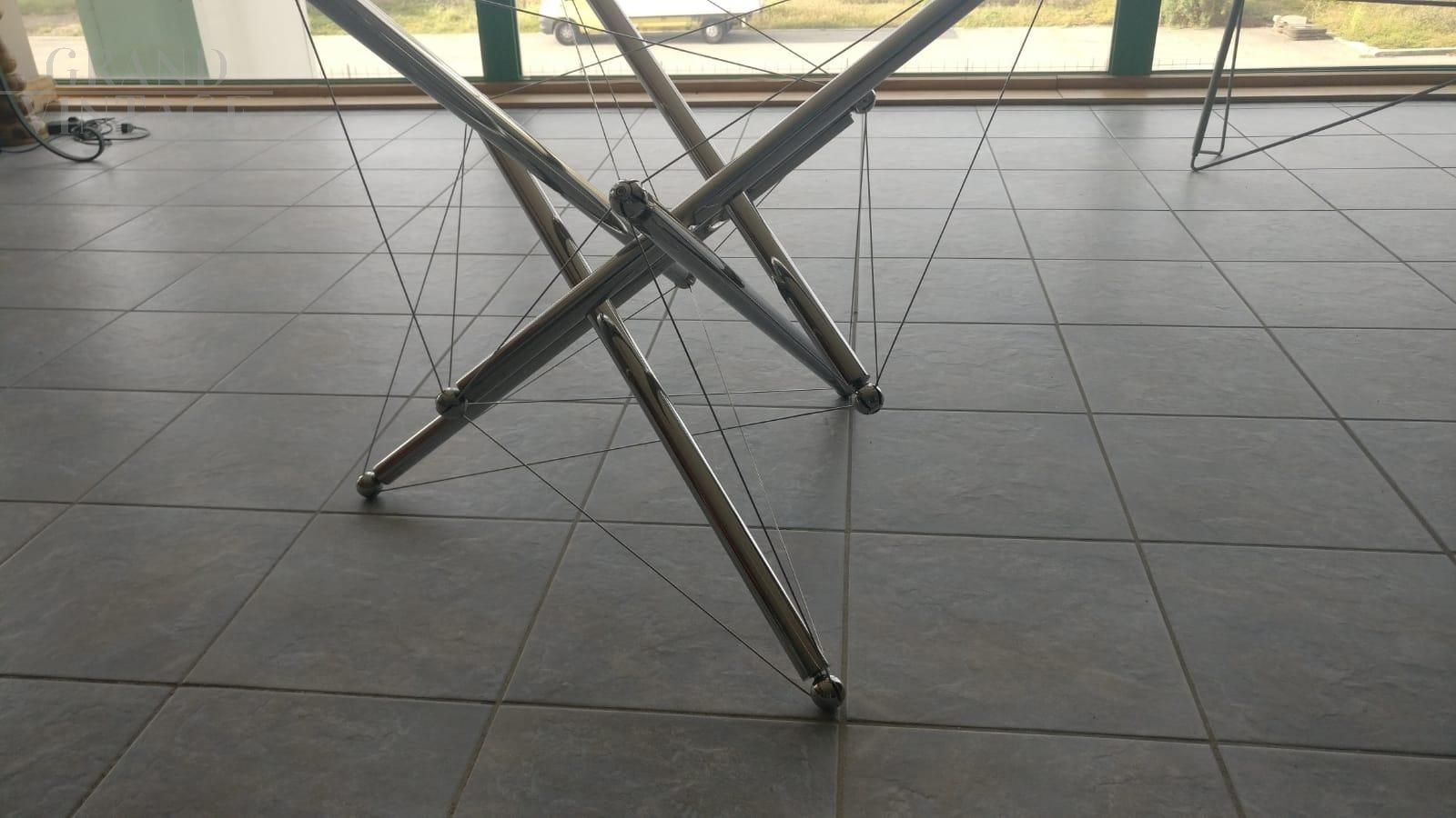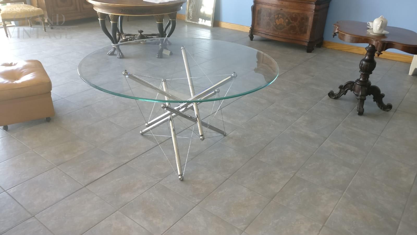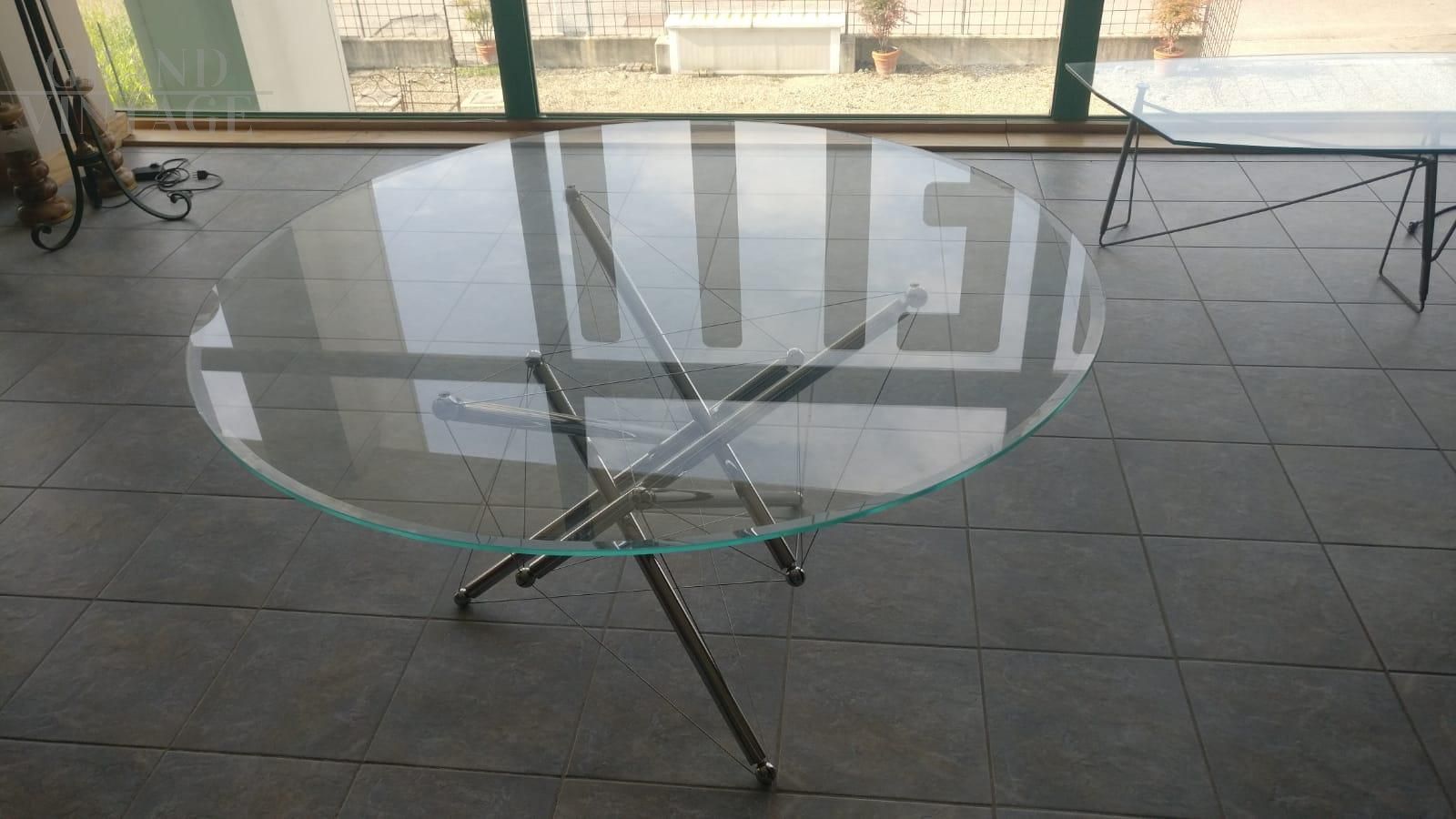 Details: Table with structure and turnbuckles in polished chromed steel, glass top (12 mm thick) with beveled edge on the lower side. Six legs, three of which support the glass top but do not touch the floor, while the other three, conversely, touch the ground without touching the top.