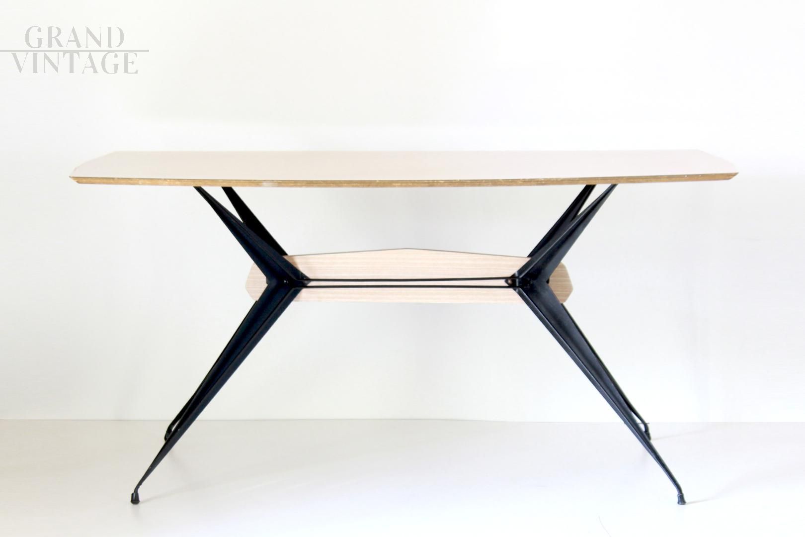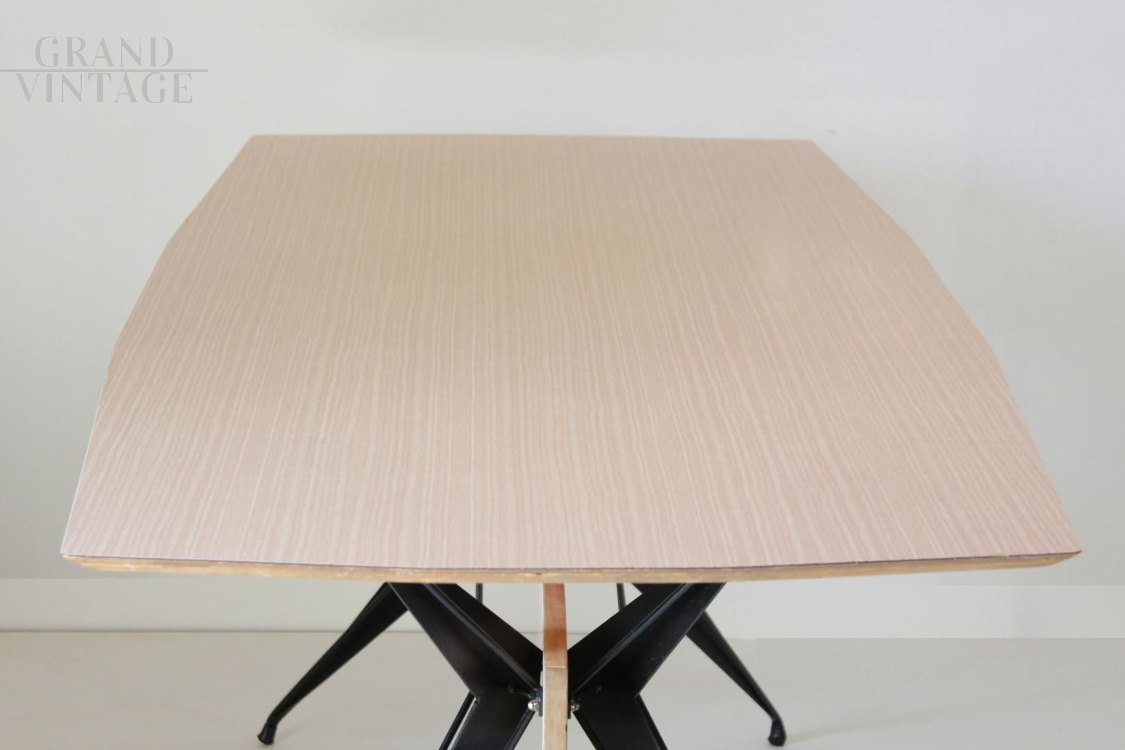 Elegant mid-century style table from the 1950s, with stylized black iron structure and beige formica top. Ideal for six people. In very good condition, with small signs of aging on the top.