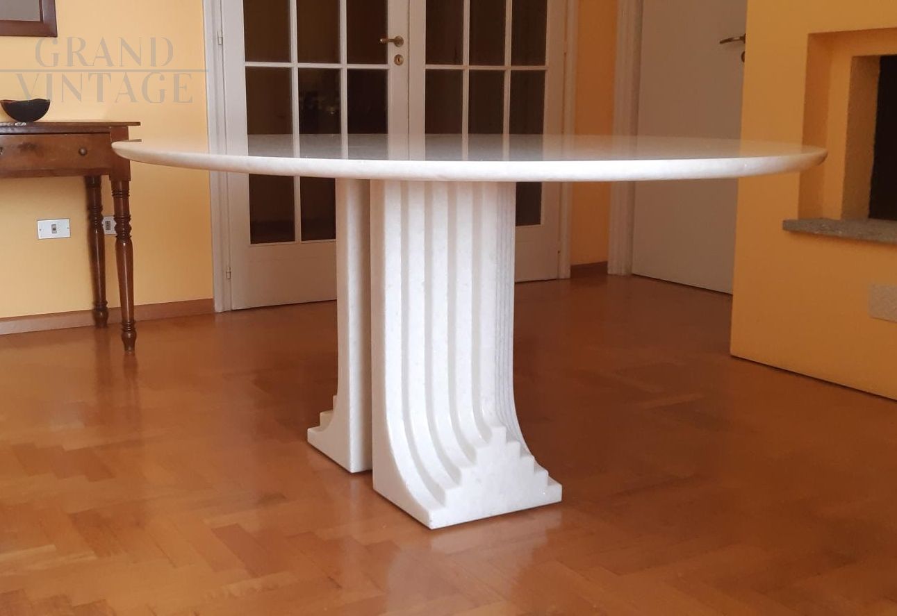 It rests on two layered pillars, in a single block. Rare example now out of production, the very thick oval top has no black veins as it was one of the last examples made with NAXOS marble which later sold out forever.