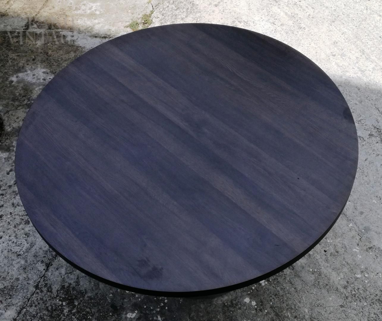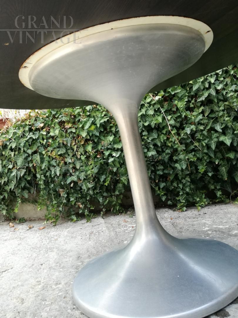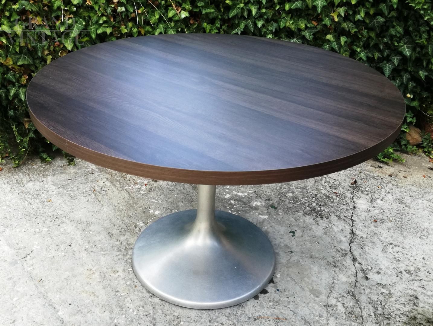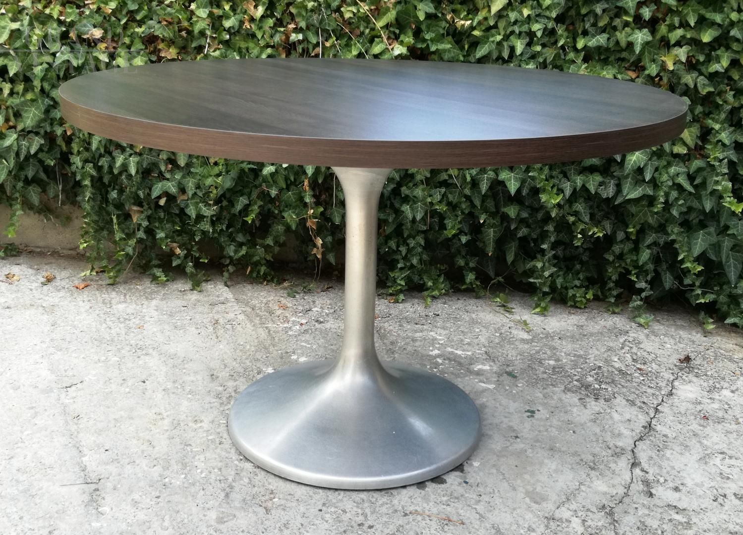Vintage Tulip style dining table with satin steel base and wenge wood top with a diameter of 120 cm and a thickness of 4 cm. The base is used and shows normal signs of use, the top is used but of more recent production. The table is stable and sturdy.