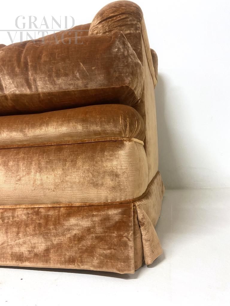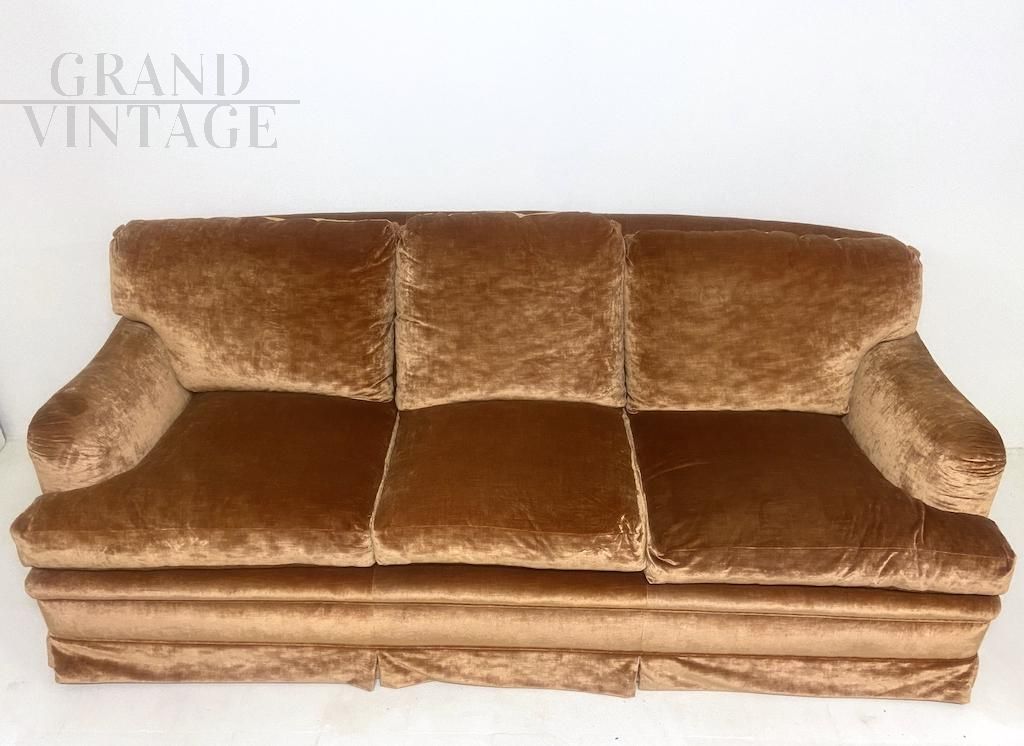 Refined Italian vintage three-seater sofa with a classic structure, entirely handcrafted and packaged, upholstered in fine tawny brown silk velvet with highlights.