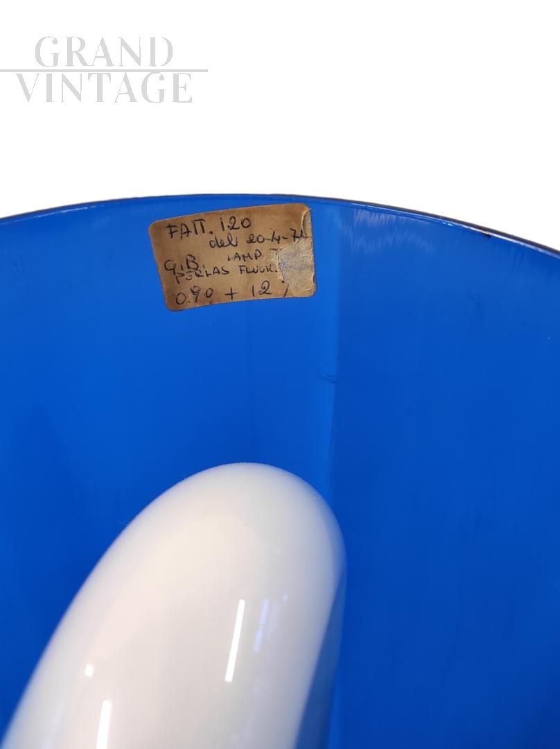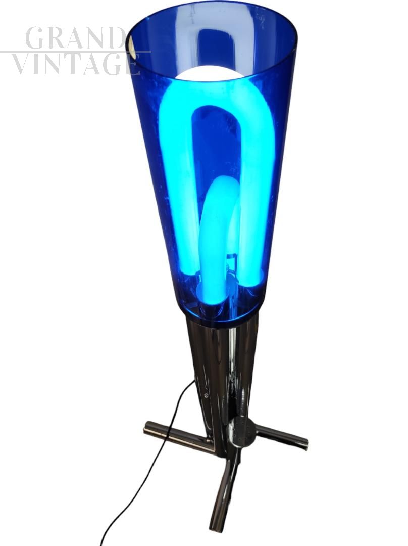 Product created in the 70s by R. Gabetti and A. Isola. "Tetralogia" model, GB Milano production. Cylindrical diffuser in blue methacrylate, containing two fluorescent lamps. The peculiarity of the lamp is that it can make the lamp come out of the blue cylinder to give an additional light effect. The product has a slight sign of wear inside the 4 cylindrical legs (see photo). Original and functioning electrical components.