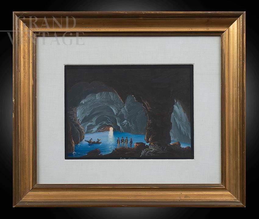 Antique Neapolitan gouache painting with coeval frame belonging to the early 20th century. The scene portrays the famous cave of Capri seen from the deepest point. In the perspective background there are four men attentive to look at the beauty of the cave as well as a small boat with two characters on board. To give depth to the whole scene is the entrance to the cave illuminated by the sun's rays. Provenance: Naples early 20th century.