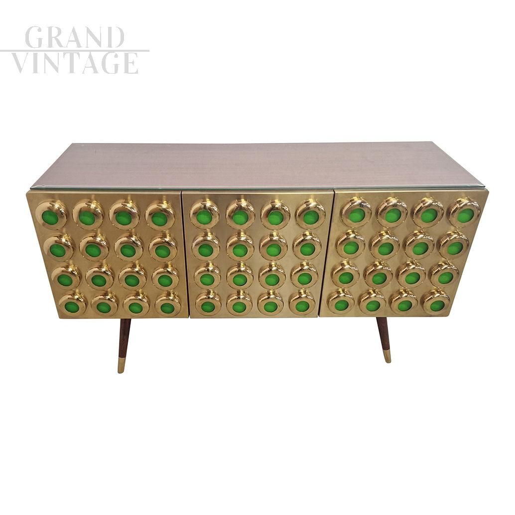 Sideboard entirely handmade with wooden structure covered in brass with green glass circle decorations. Equipped with three doors and an internal shelf.