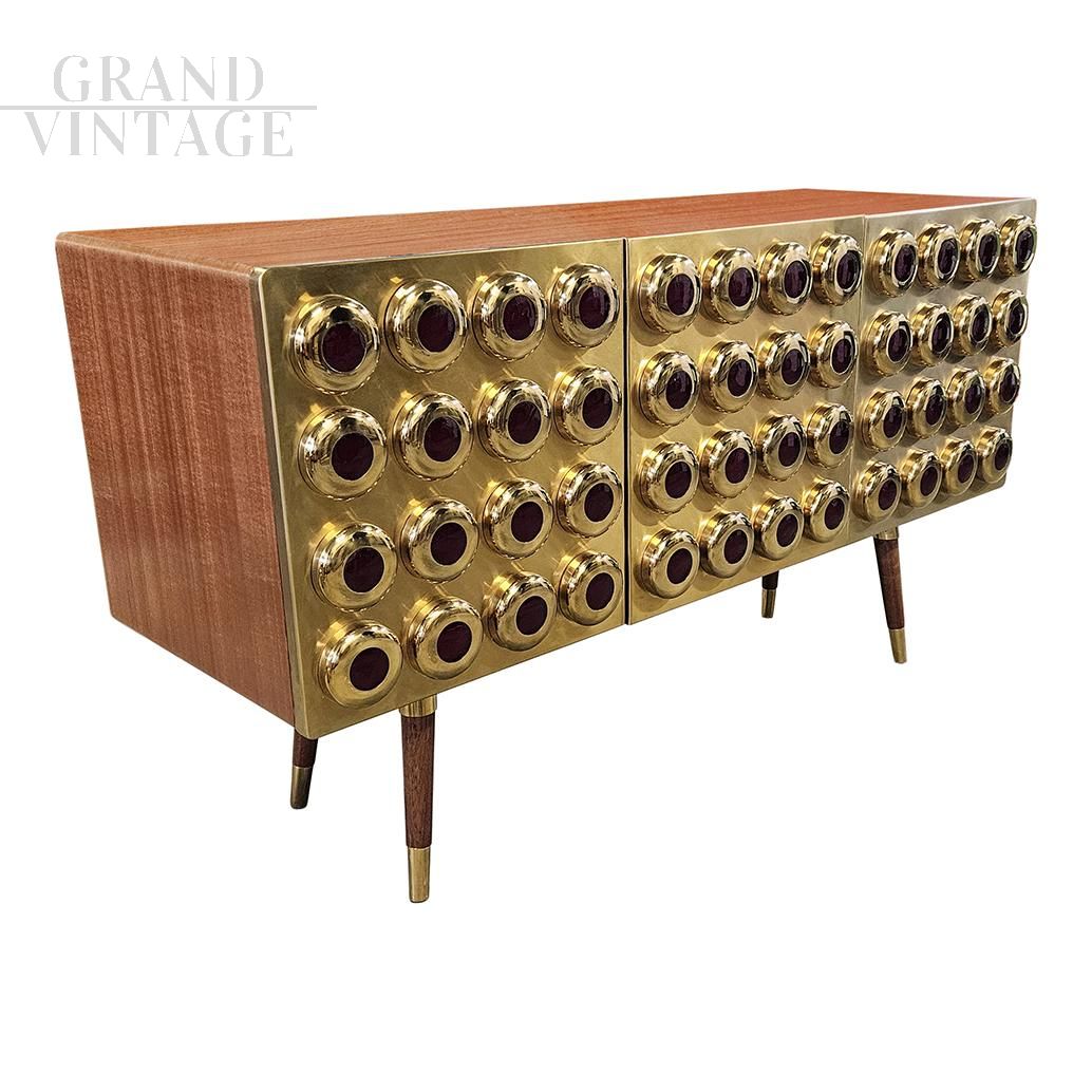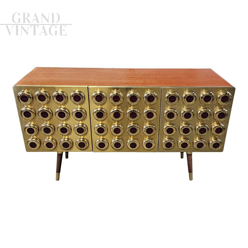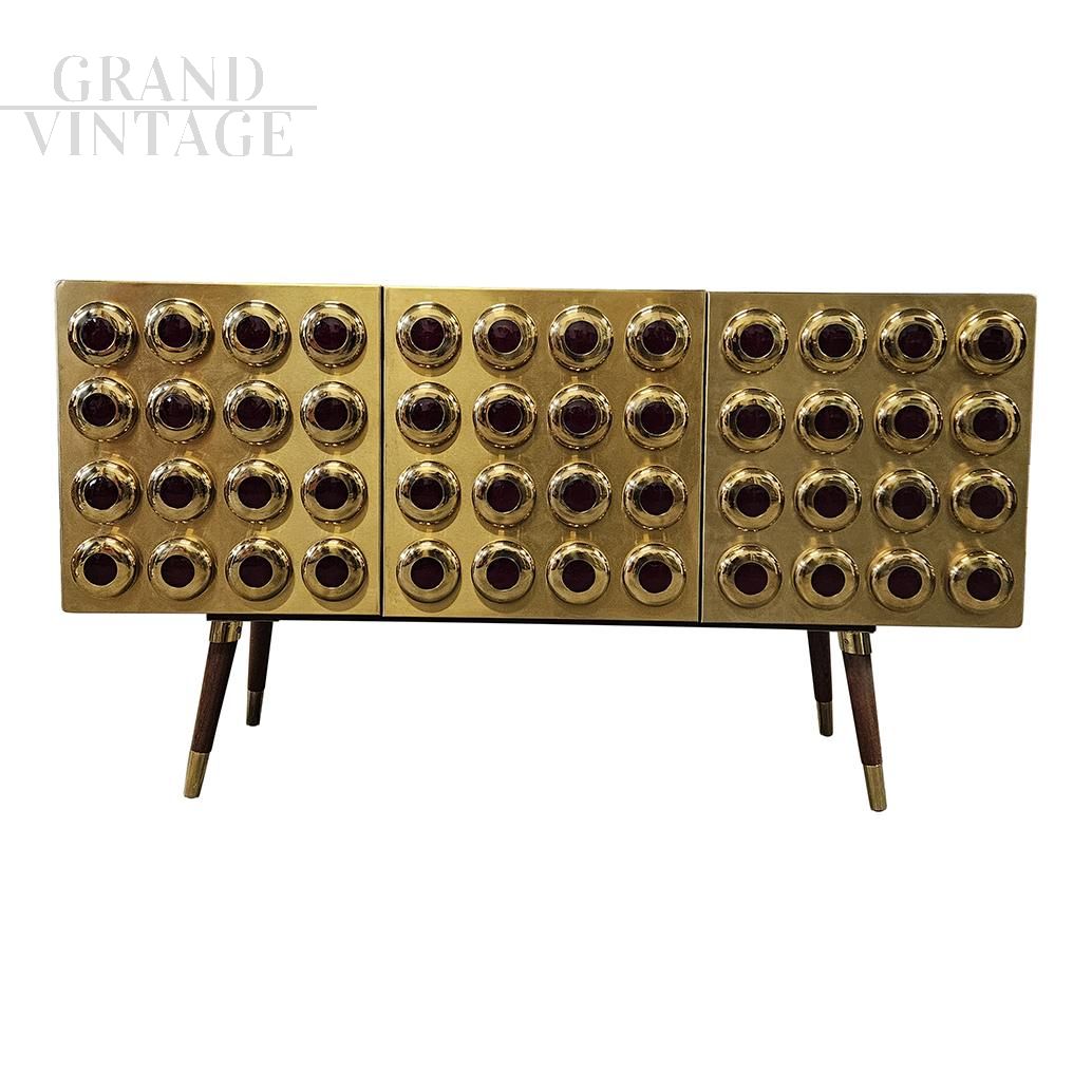 Entirely handcrafted sideboard with wooden structure covered in brass with red glass circle decorations. Equipped with three doors and an internal shelf.