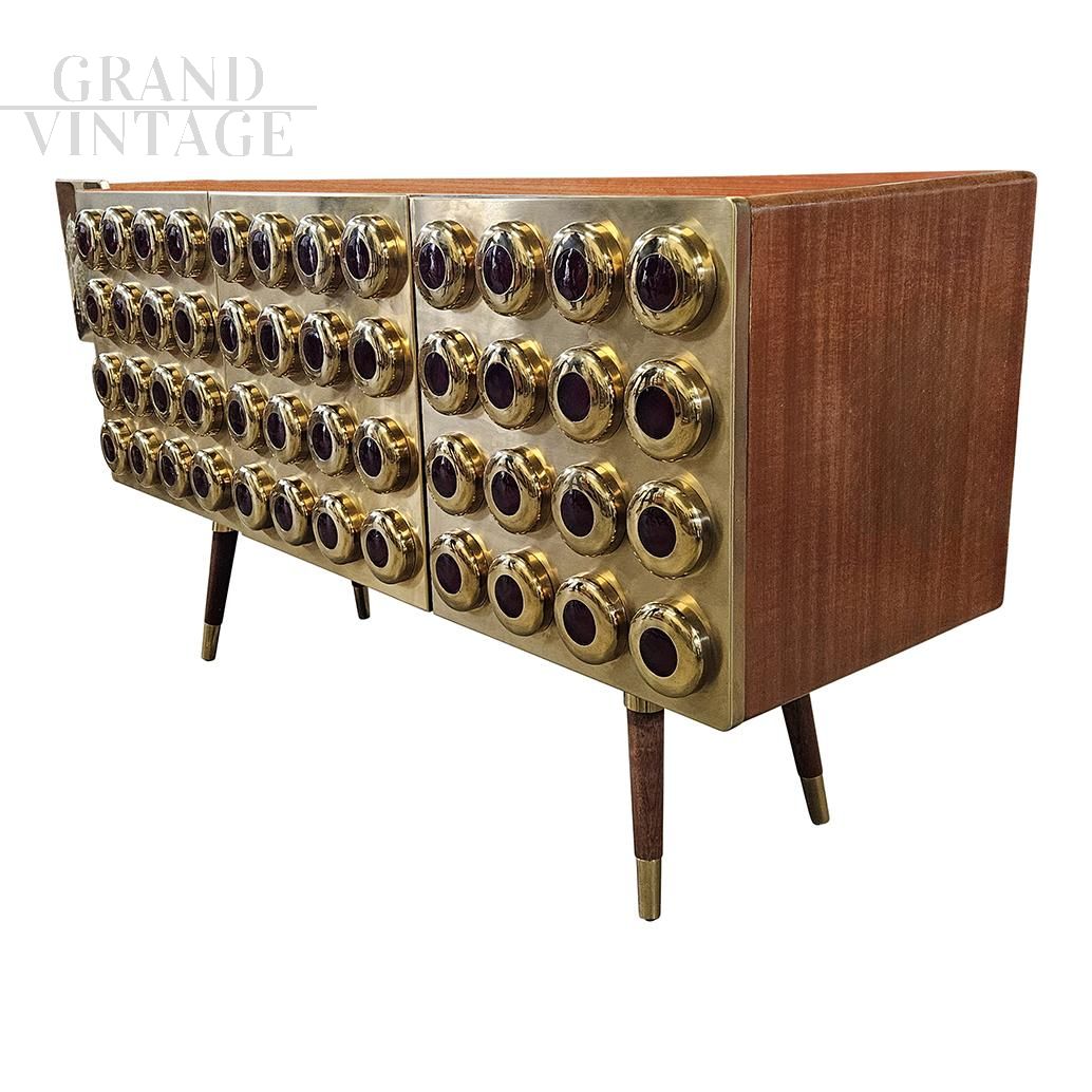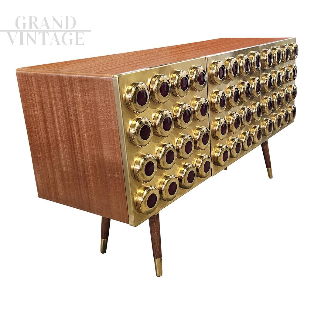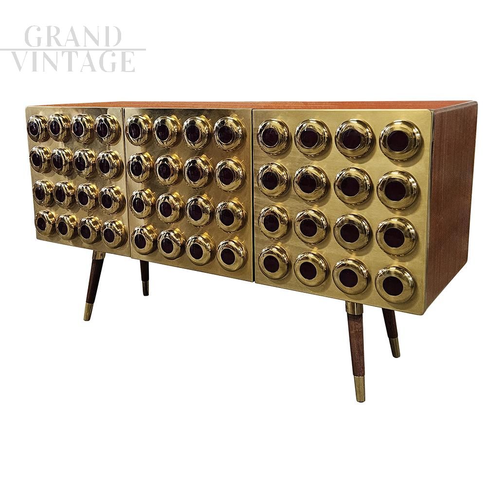 Entirely handcrafted sideboard with wooden structure covered in brass with red glass circle decorations. Equipped with three doors and an internal shelf.