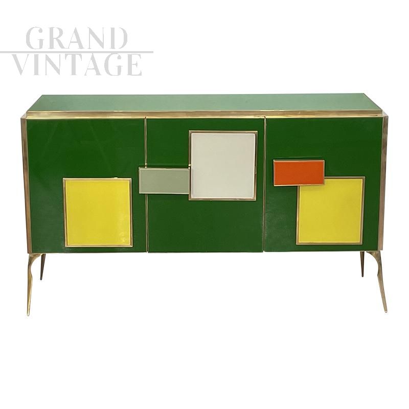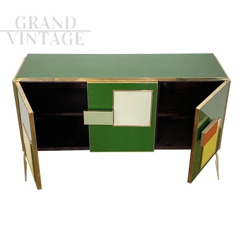 Three-door sideboard entirely handmade, with wooden structure and green glass surface finishes; profiles and feet in gilded brass, handles and decorations in colored glass and gilded brass, gilded internal shelf.
