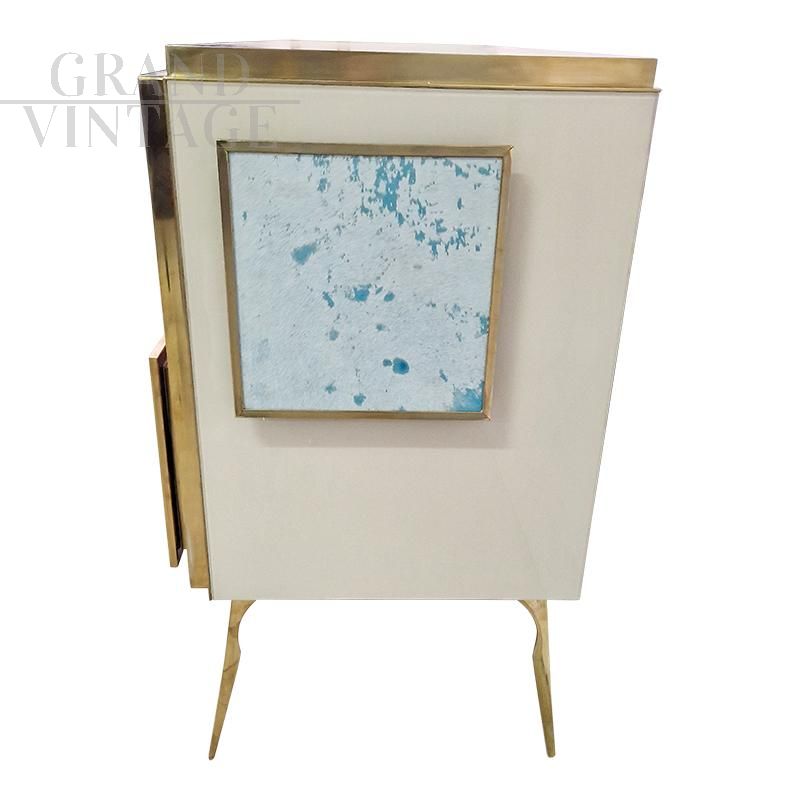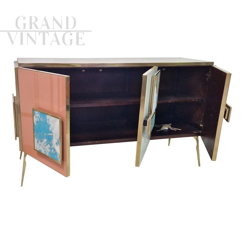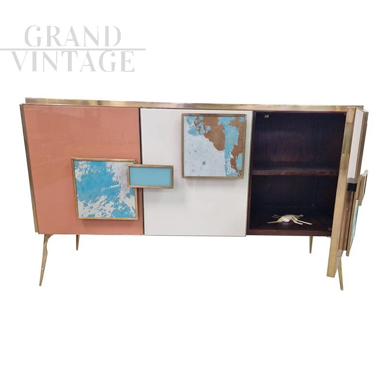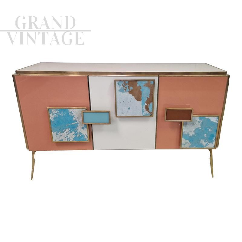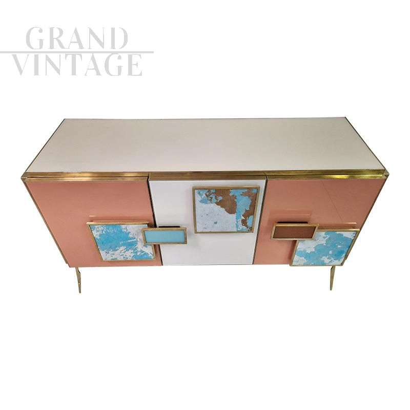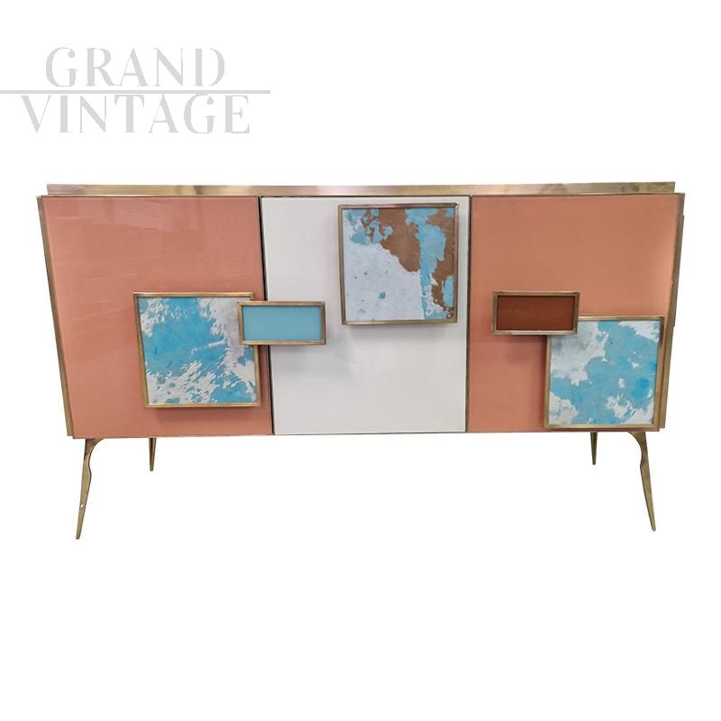 Three-door sideboard, equipped with an internal shelf, entirely handmade, with a wooden structure covered in glass in salmon and white colours; profiles and feet in golden brass. White and light blue pony skin handles. Backlit handles with LED strips that can be operated with a special remote control.