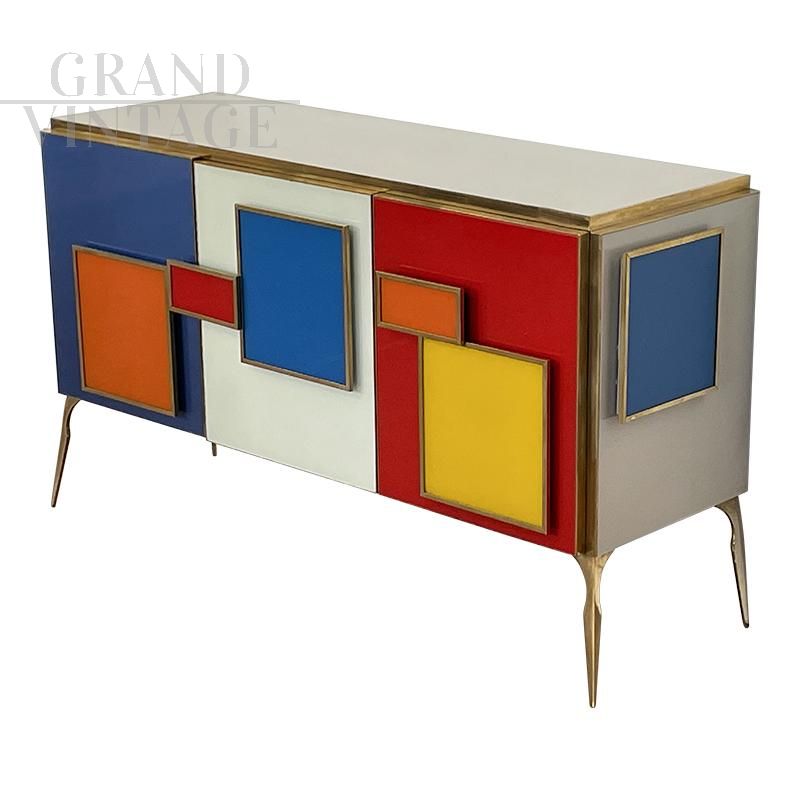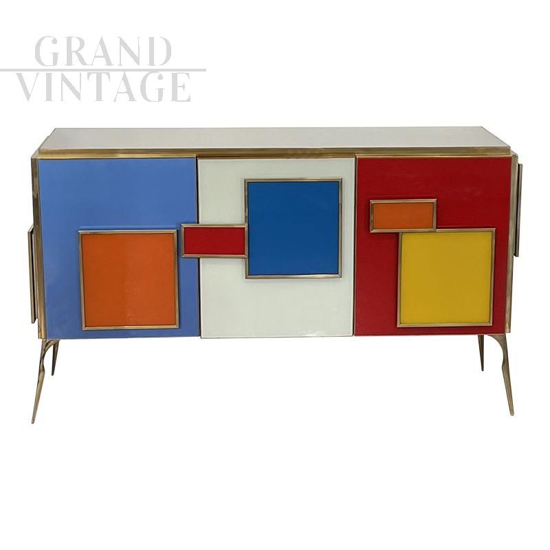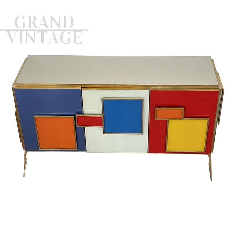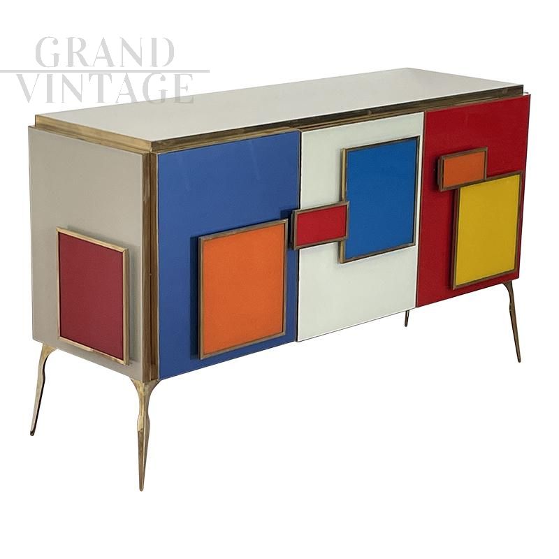 Three-door sideboard, entirely handmade, with wooden structure and multicolored glass surface finishes; profiles and feet in golden brass, LED-lit handles in colored glass and golden brass, equipped with an internal shelf.