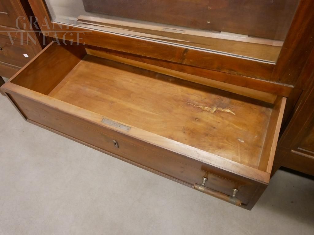 Three-door mahogany wardrobe with central mirror from the early 1900s, Louis XVI style, made in the 1920s / 1930s. The wood is mahogany veneered with inlays and fillets. Two small doors on the sides and one door with central mirror, equipped with three drawers in the lower part. The wardrobe is not restored, it is in good general condition, it has the natural signs of aging, as shown in the photos. Original paint.