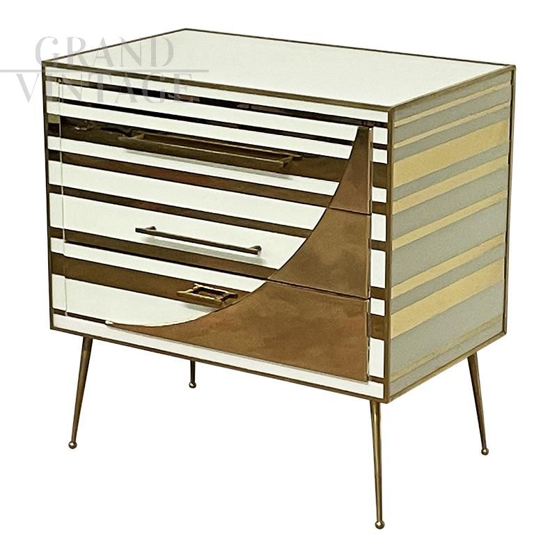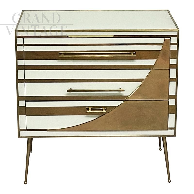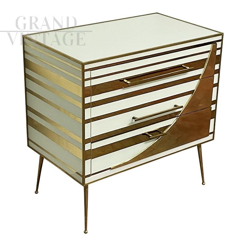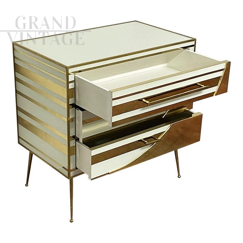 Dresser with three drawers, entirely handmade, with wooden structure and covered in white and gold glass, with handle profiles and feet in golden brass.