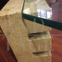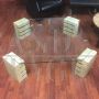 70s coffee table with thick glass top resting on four travertine bases milled to adjust the height of the top.