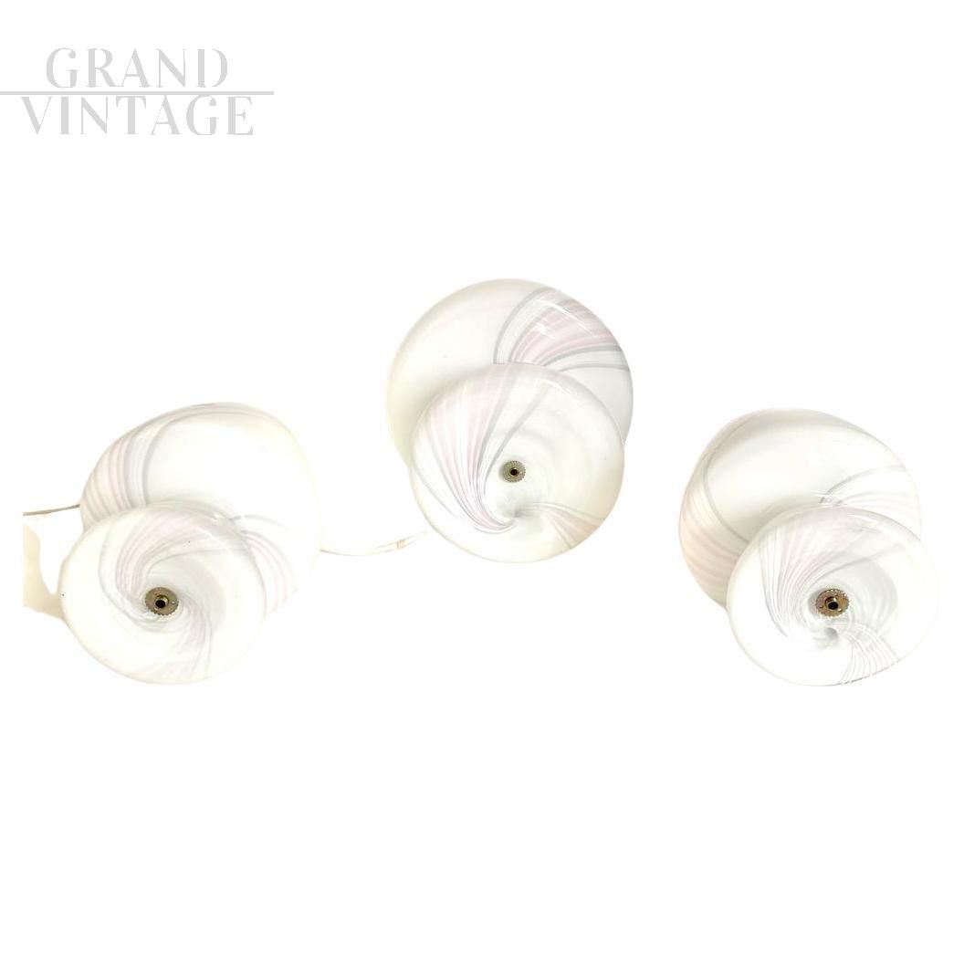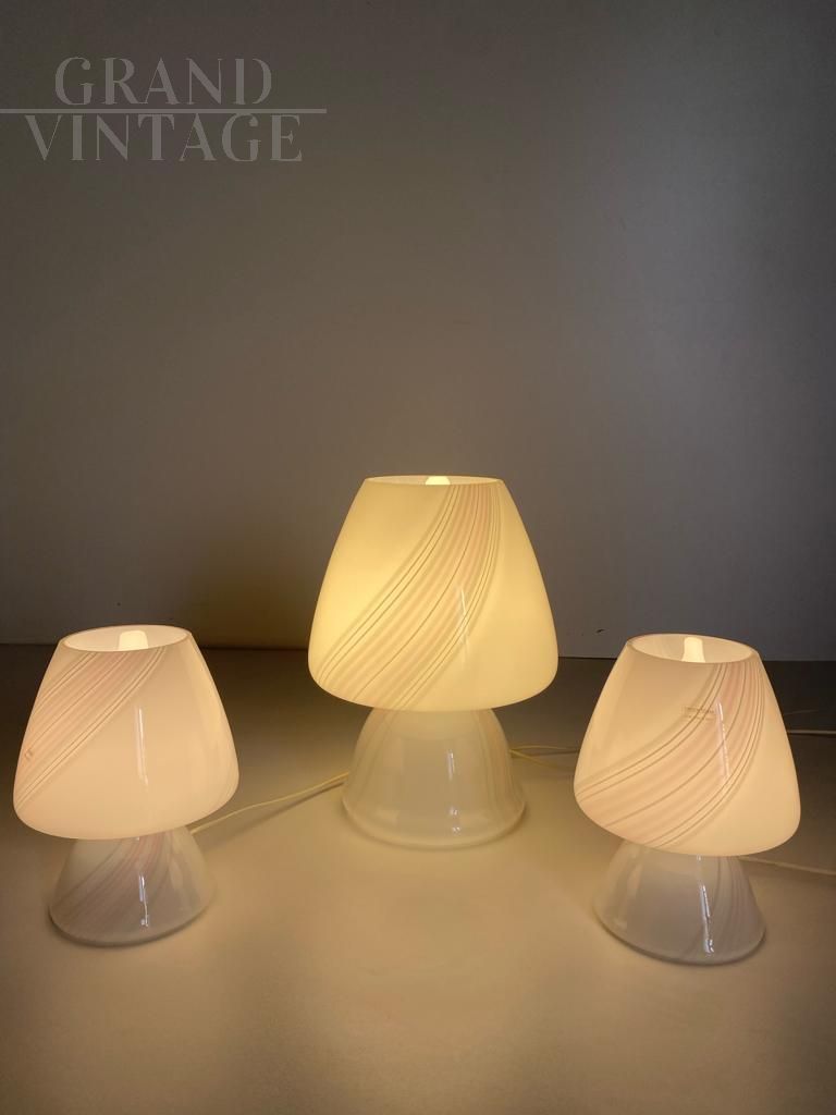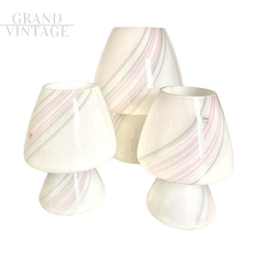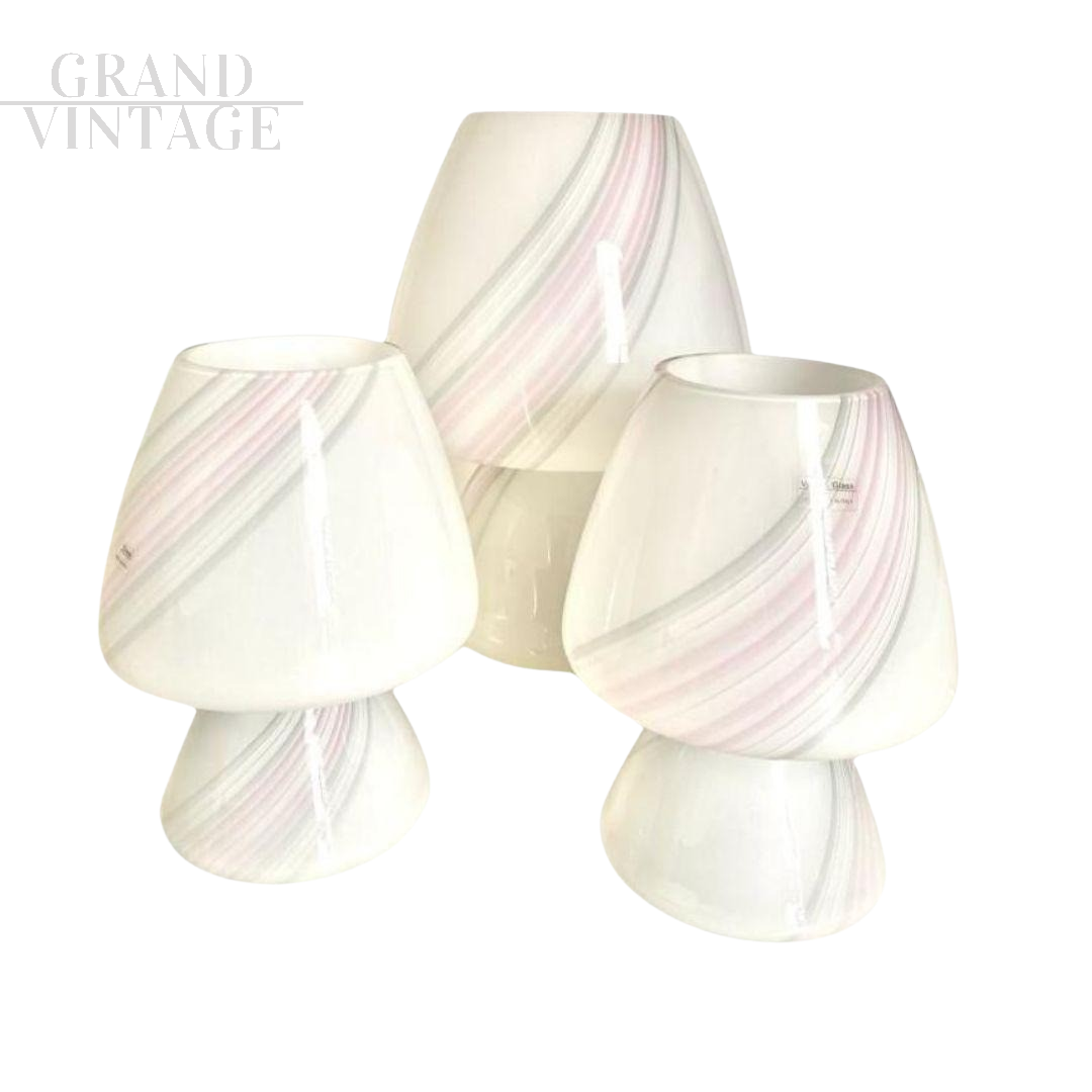 Set of three elegantly finished Murano glass mushroom table lamps, made in Italy in the late 1970s by Maestri Muranesi, Venice, Italy. Set composed of two small mushroom lamps and one larger one. White Murano glass with gray streaks. Lamps overhauled and in perfect working order, with intact and unbroken glass, complete with original labels, ideal for furnishing a bedroom or living room.