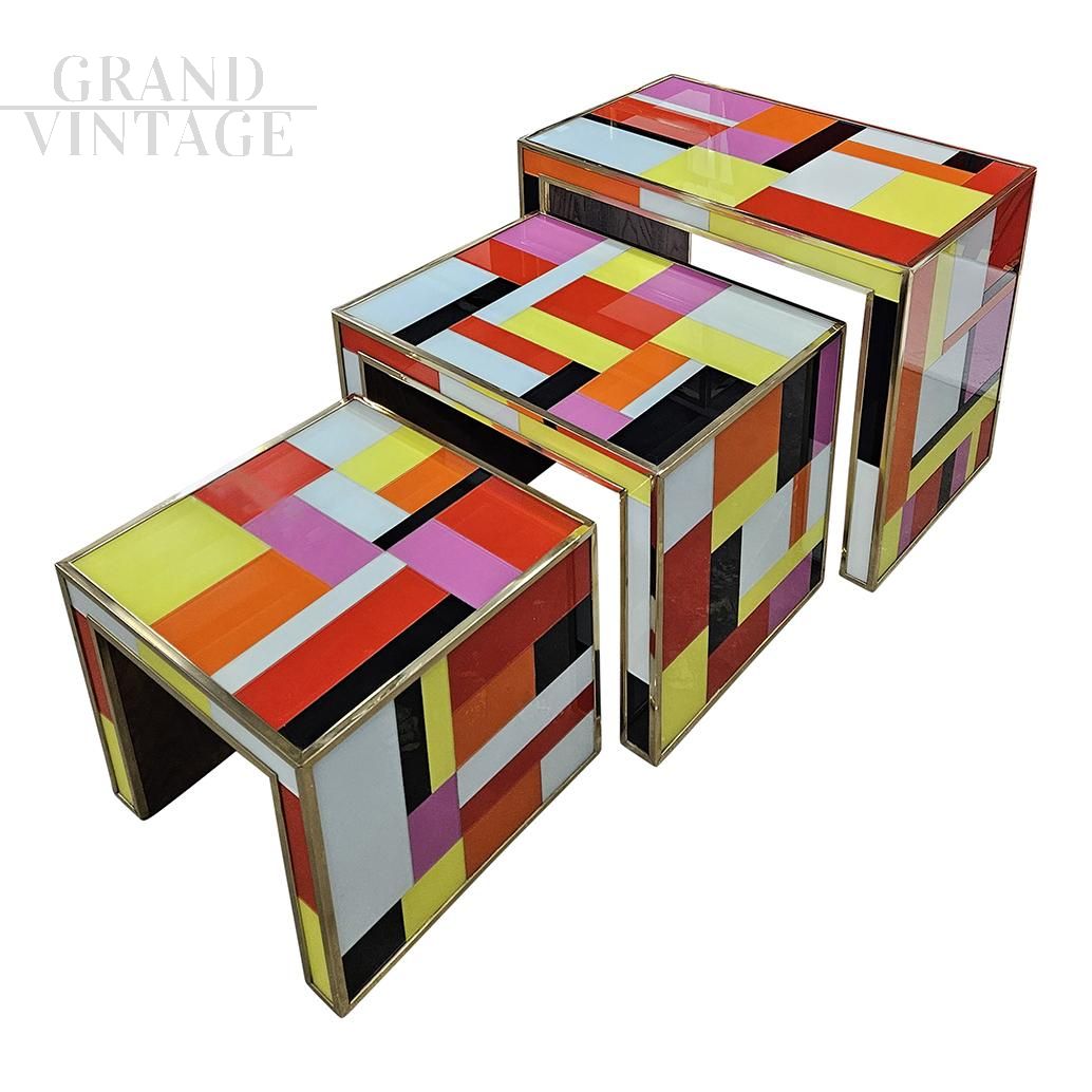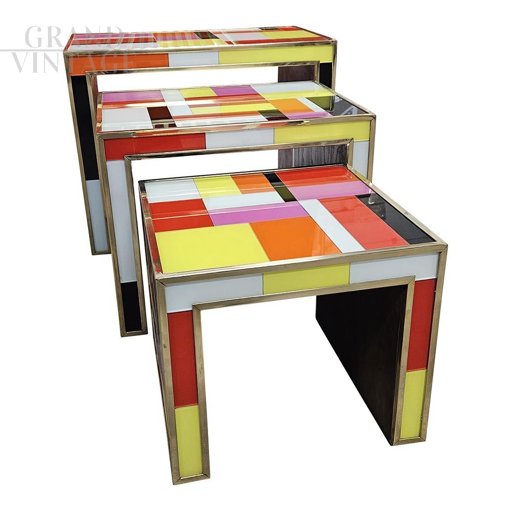 Trio of stackable nesting tables, handmade in wood and covered in colored glass, enriched with golden brass profiles.