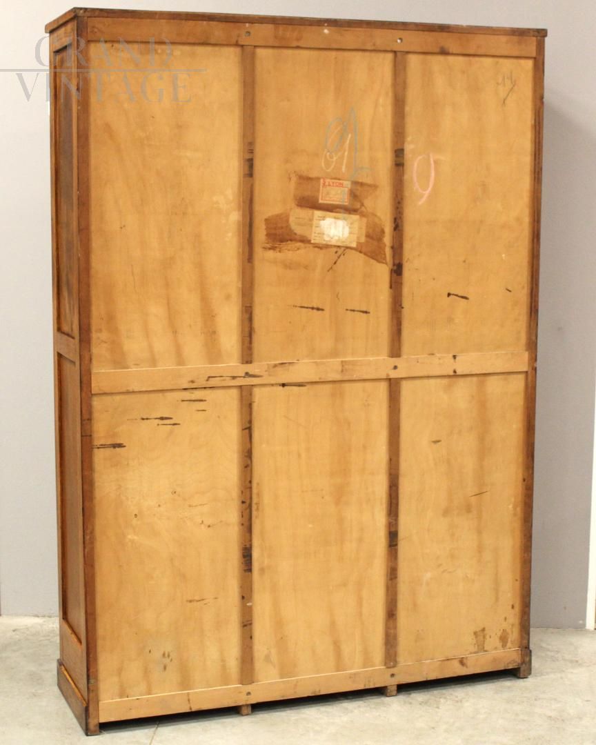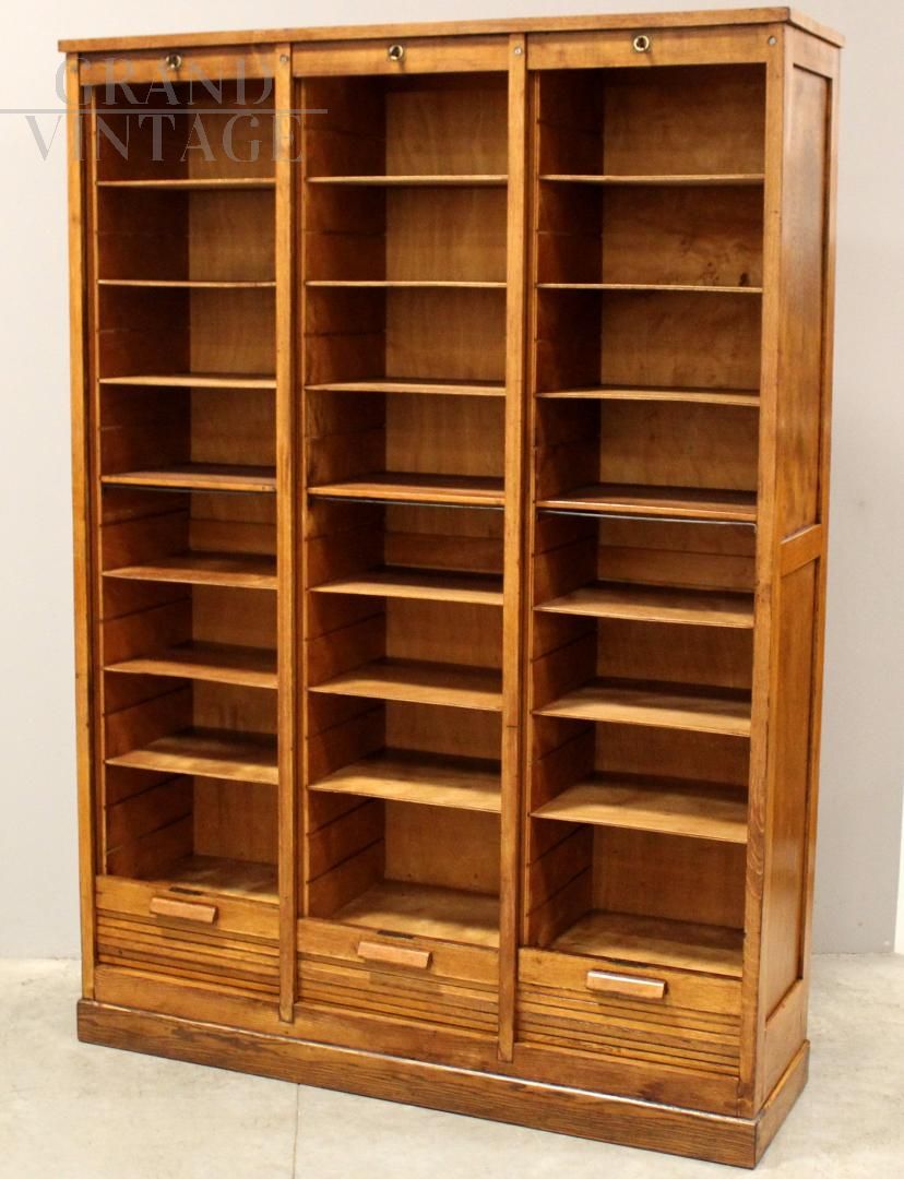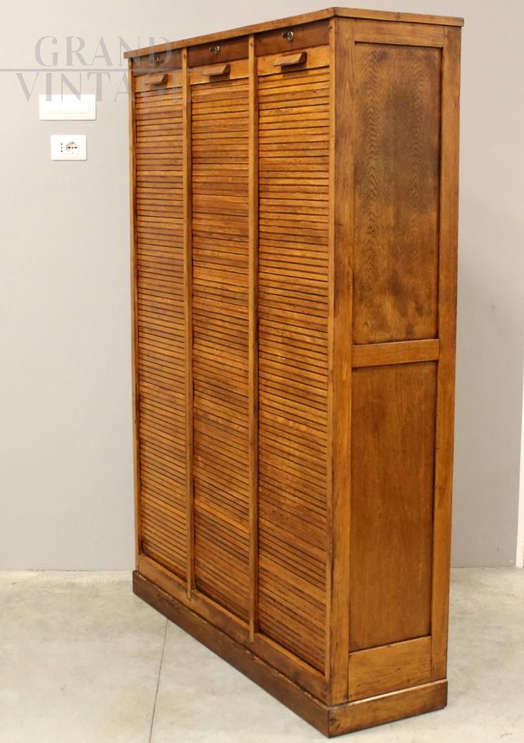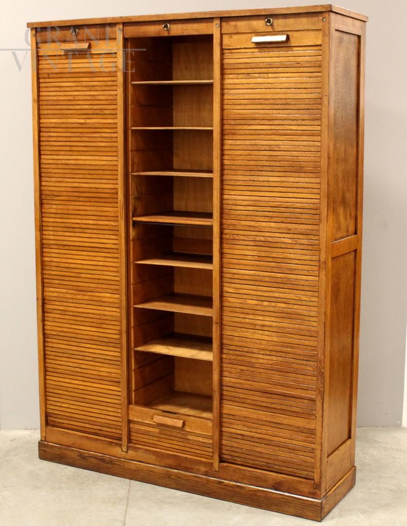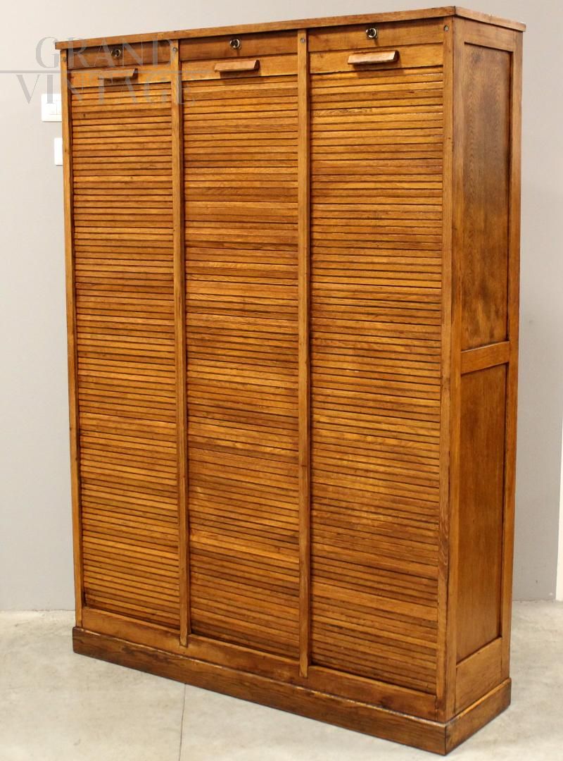 Large triple roller shutter filing cabinet in oak, early 1900s, restored.