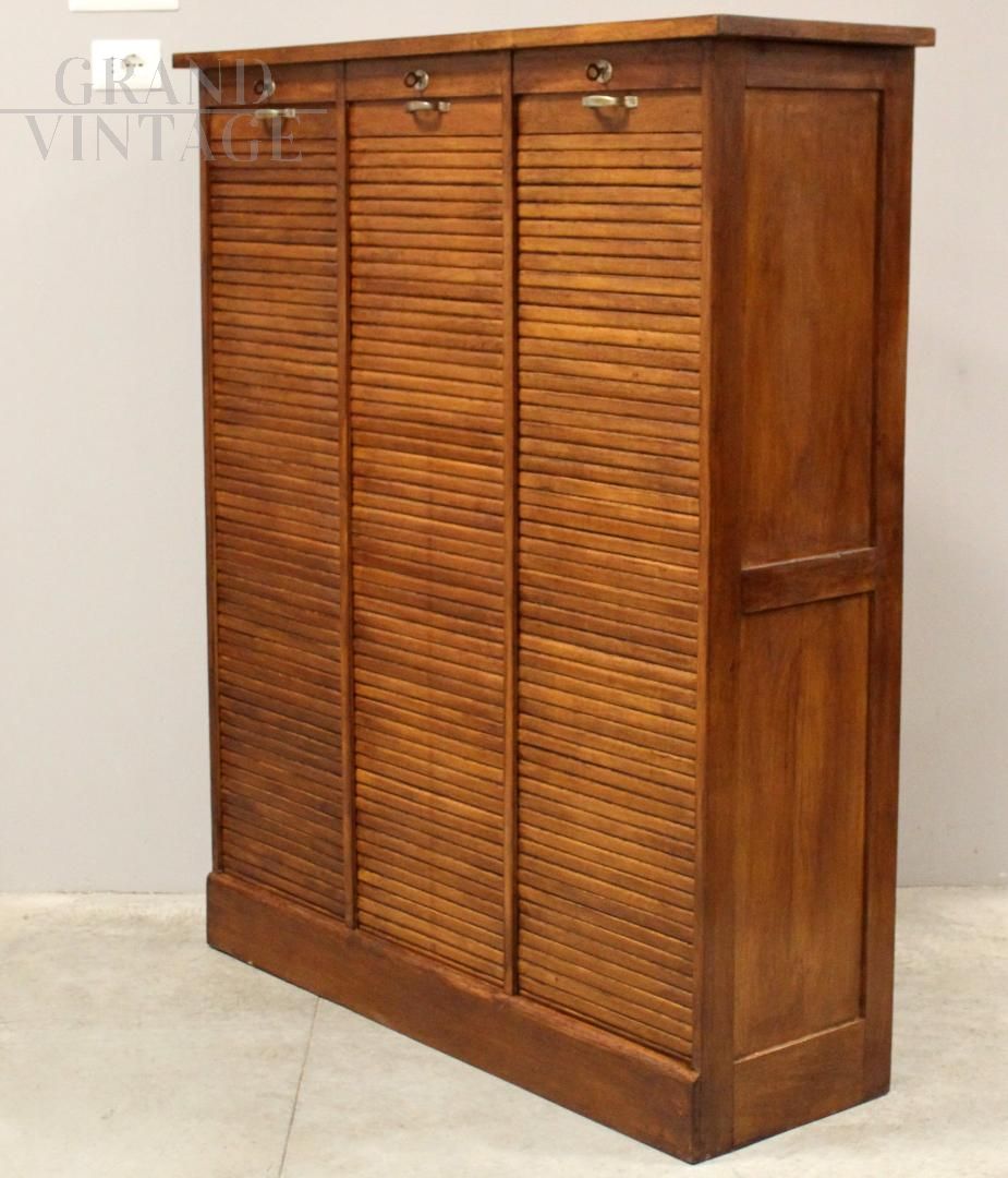 Office bookcase filing cabinet with triple rolling shutter in oak, early 1900s, restored.
