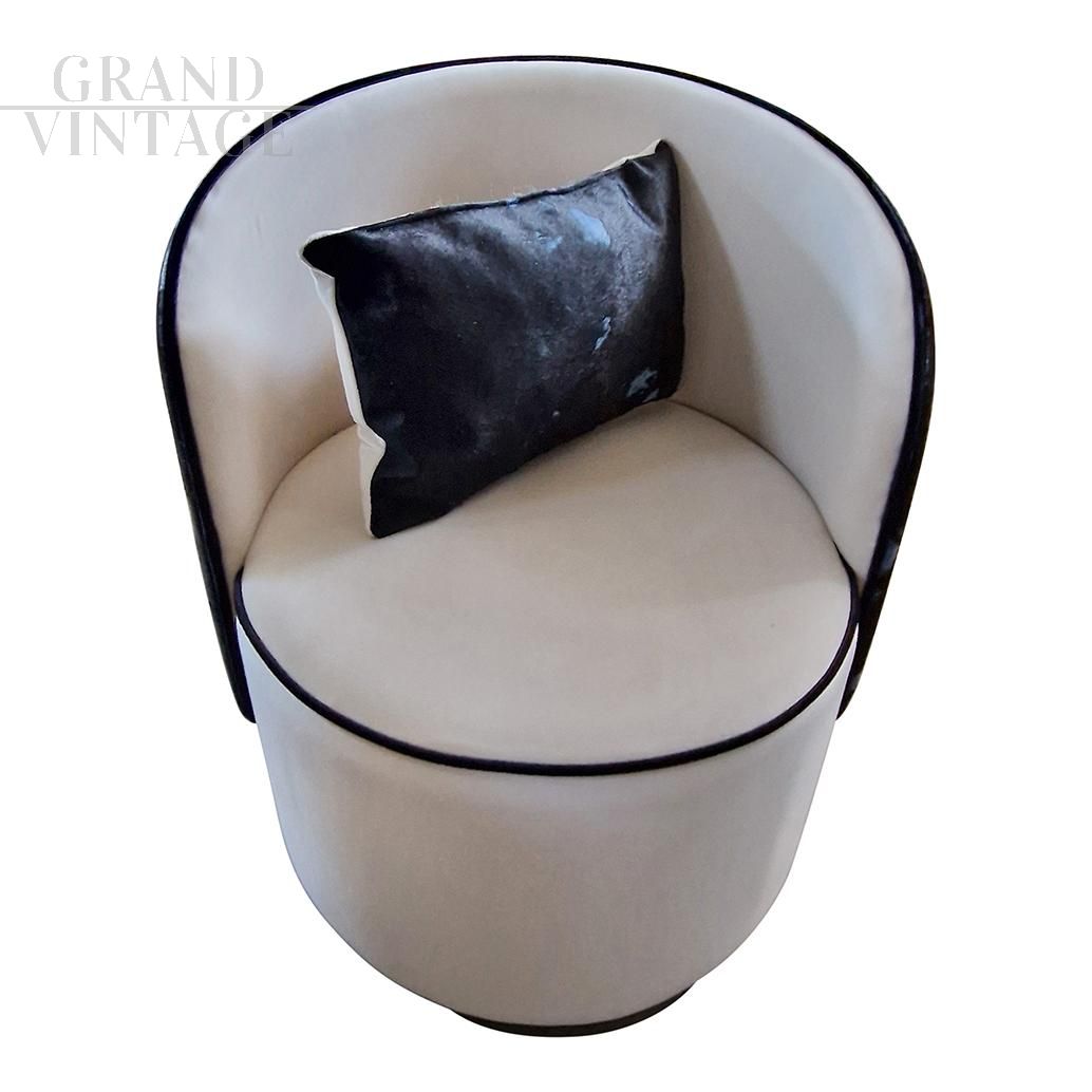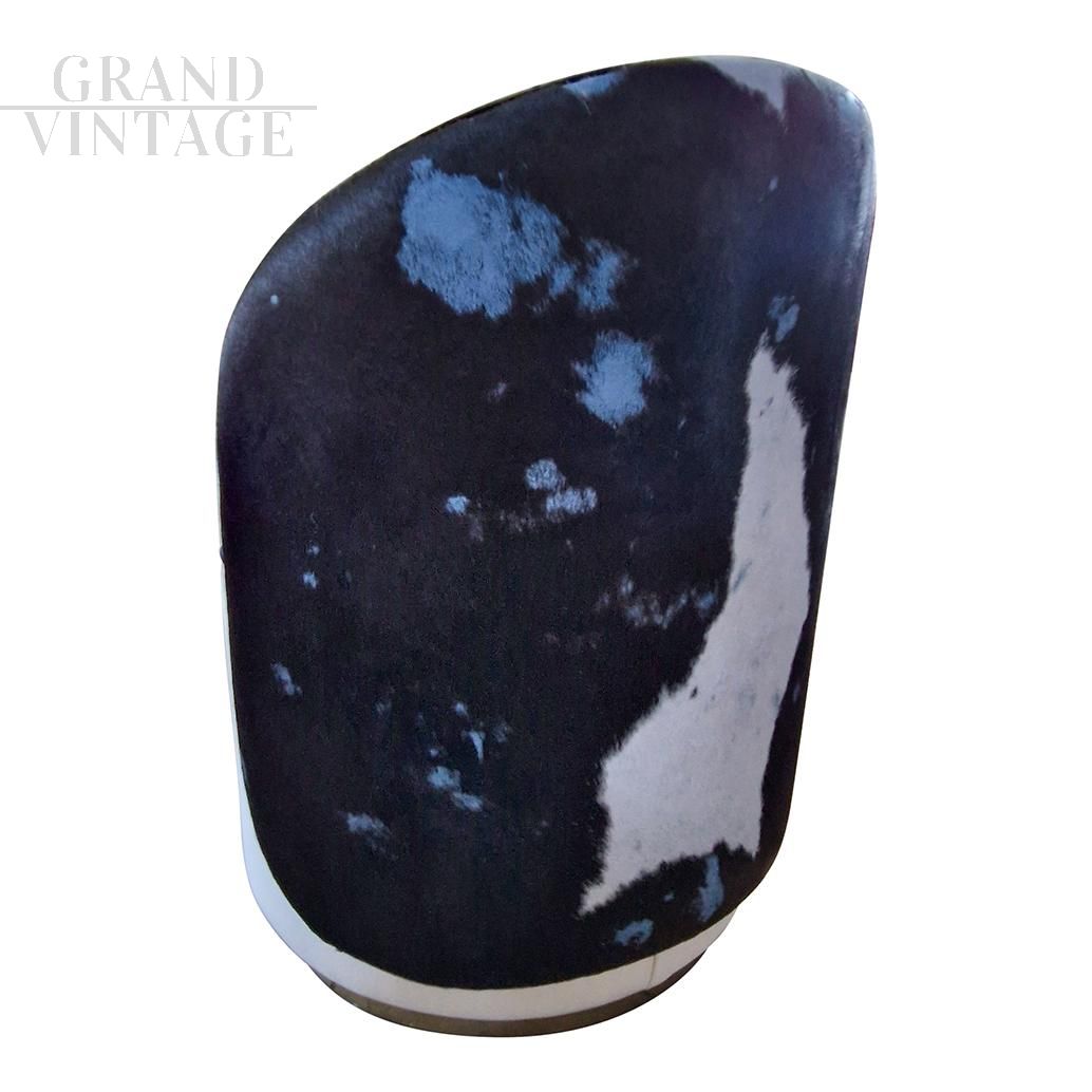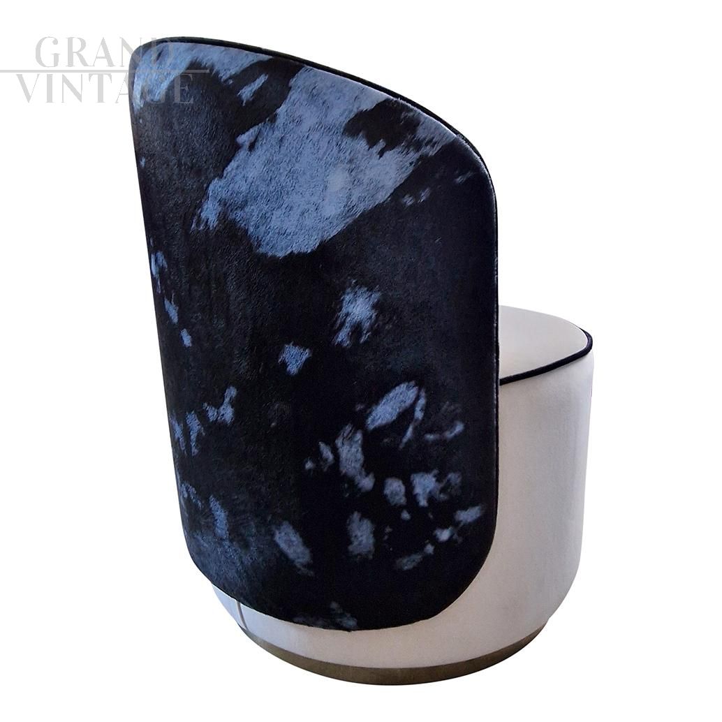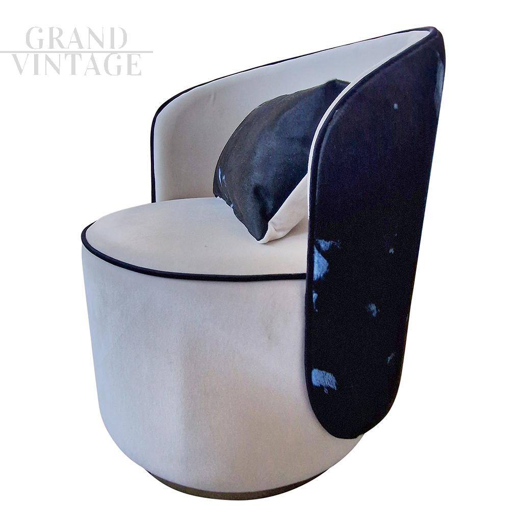 Tub armchair in white velvet and blue and light blue dyed ponyskin