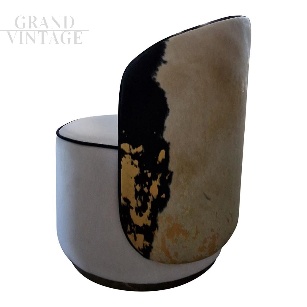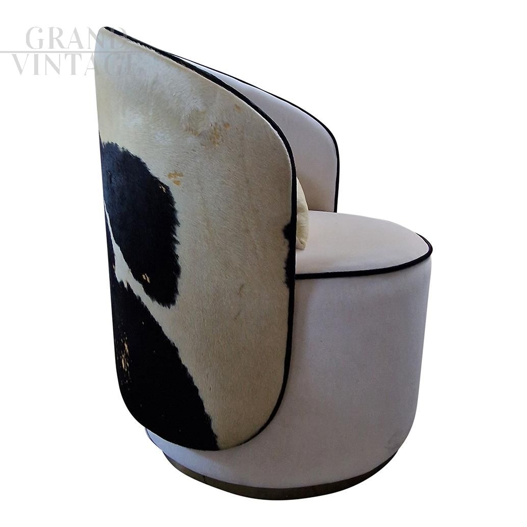 Art Deco style tub armchair in white velvet with cream yellow and black dyed ponyskin back, with matching cushion.