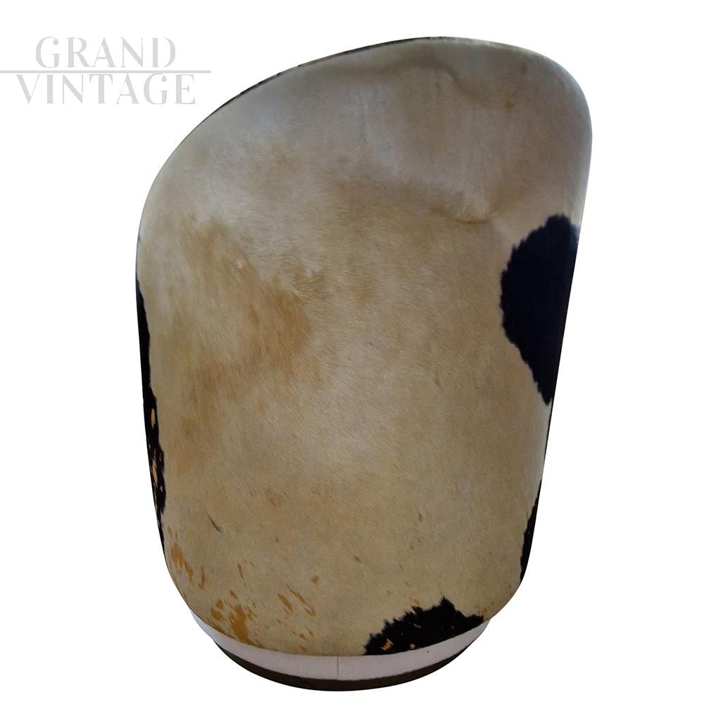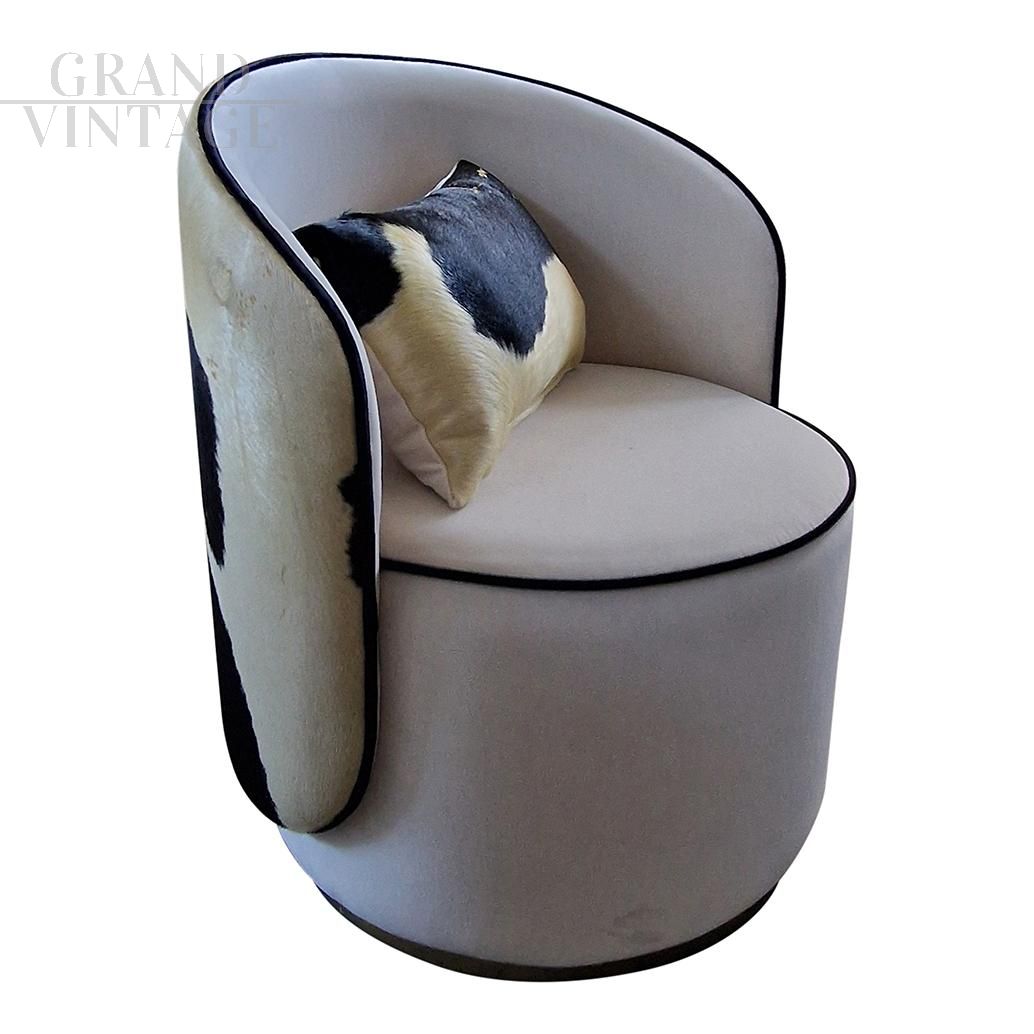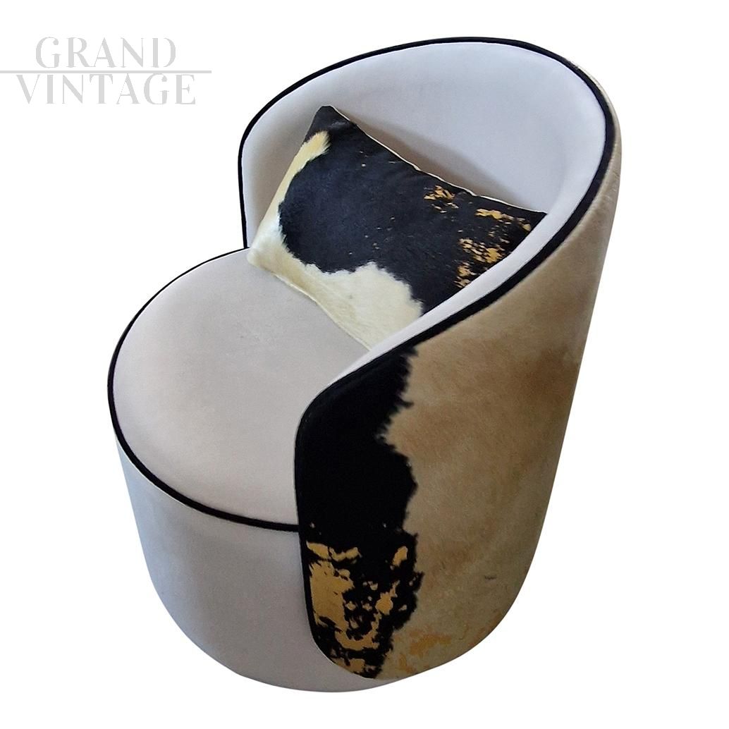 Tub armchair in white velvet and cream yellow dyed ponyskin