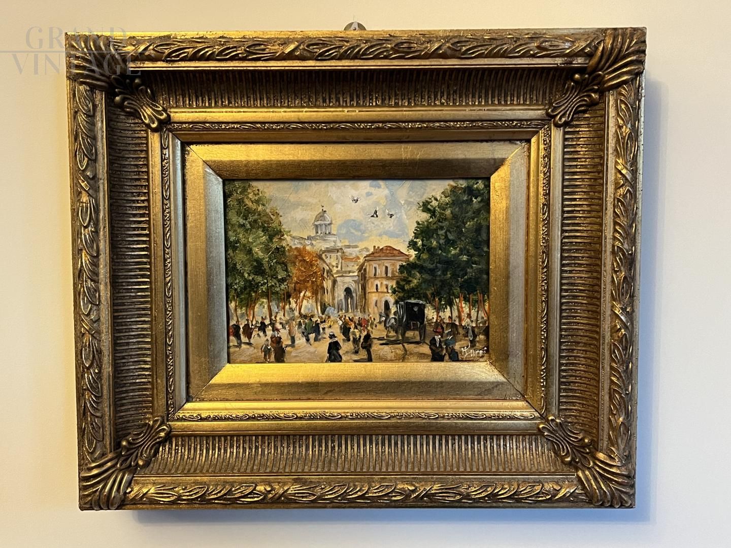 Valuable painting by the Italian artist Turri depicting the view of an Italian square. A brightly colored artwork created in oil on panel and hand-signed by the artist on the bottom right. The panel is enclosed within a valuable golden frame which further enhances the painting. This artwork comes with certificate of authenticity.
