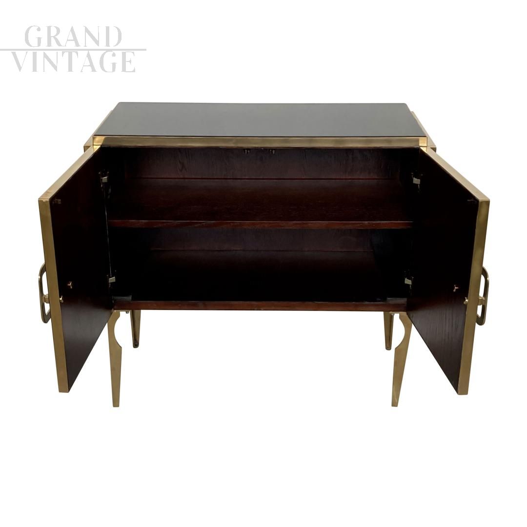 Sideboard with two doors, entirely handmade, with wooden structure and surface finishes in black Murano glass; profiles, handles and feet in gilded brass.