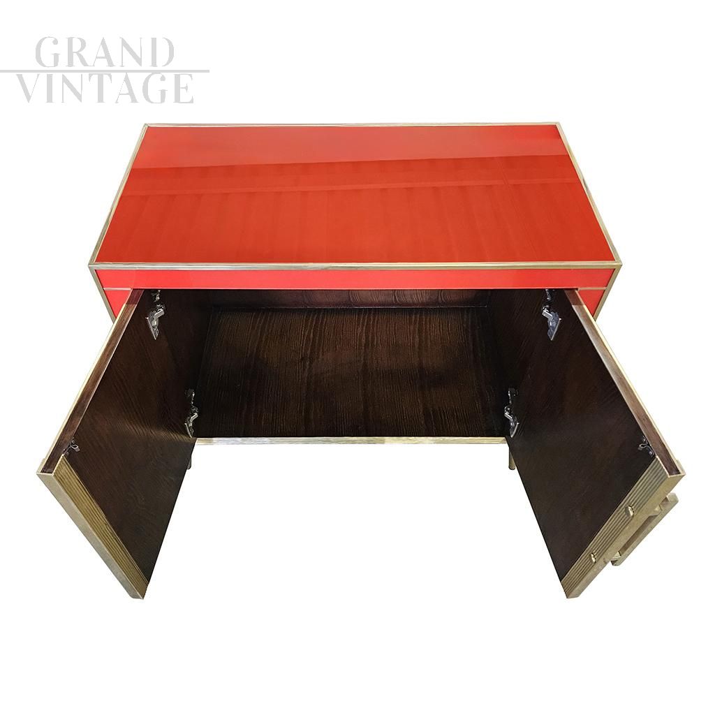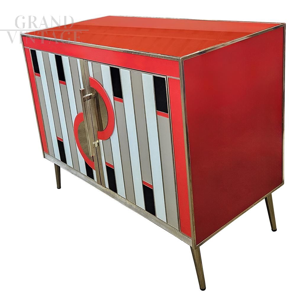 Sideboard with two doors entirely handmade with wooden structure and covered in red, black, gray and white Murano glass; enriched with crescent-shaped handles; profiles and feet in golden brass.